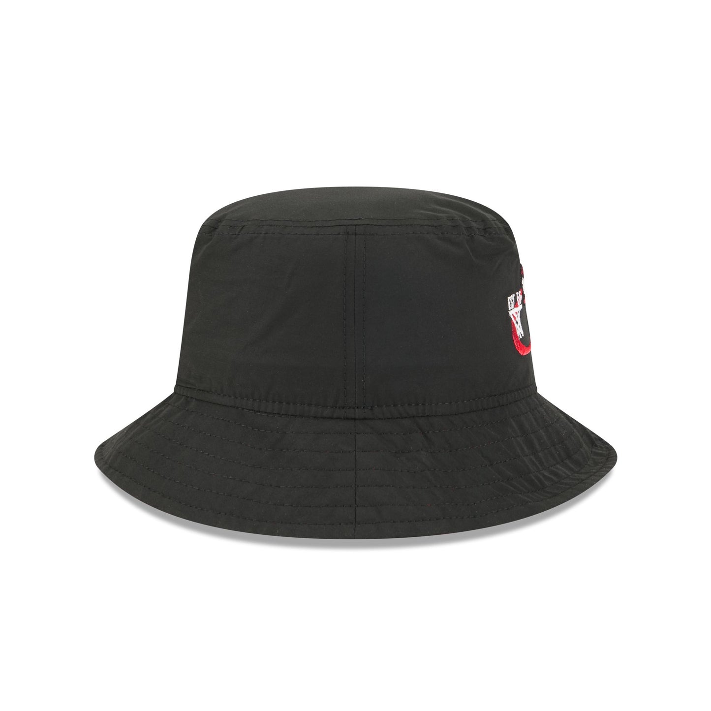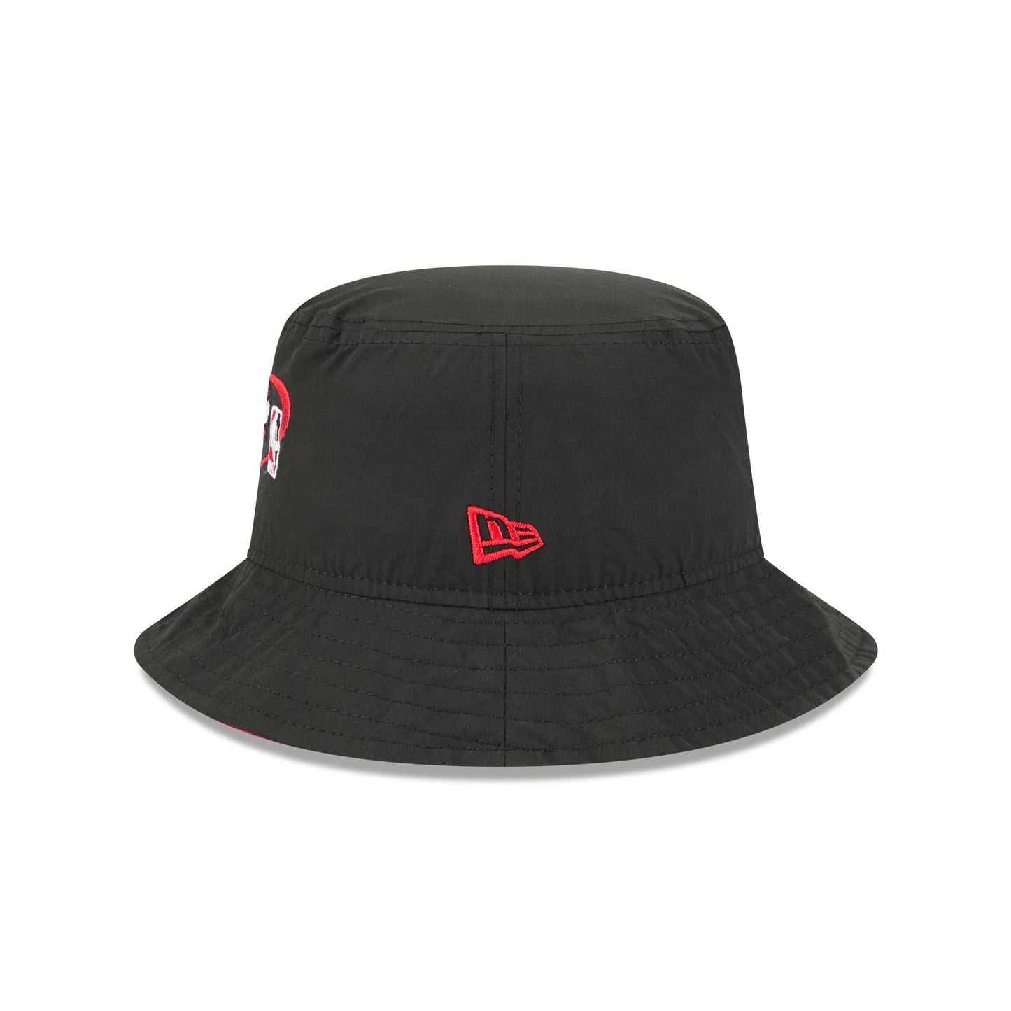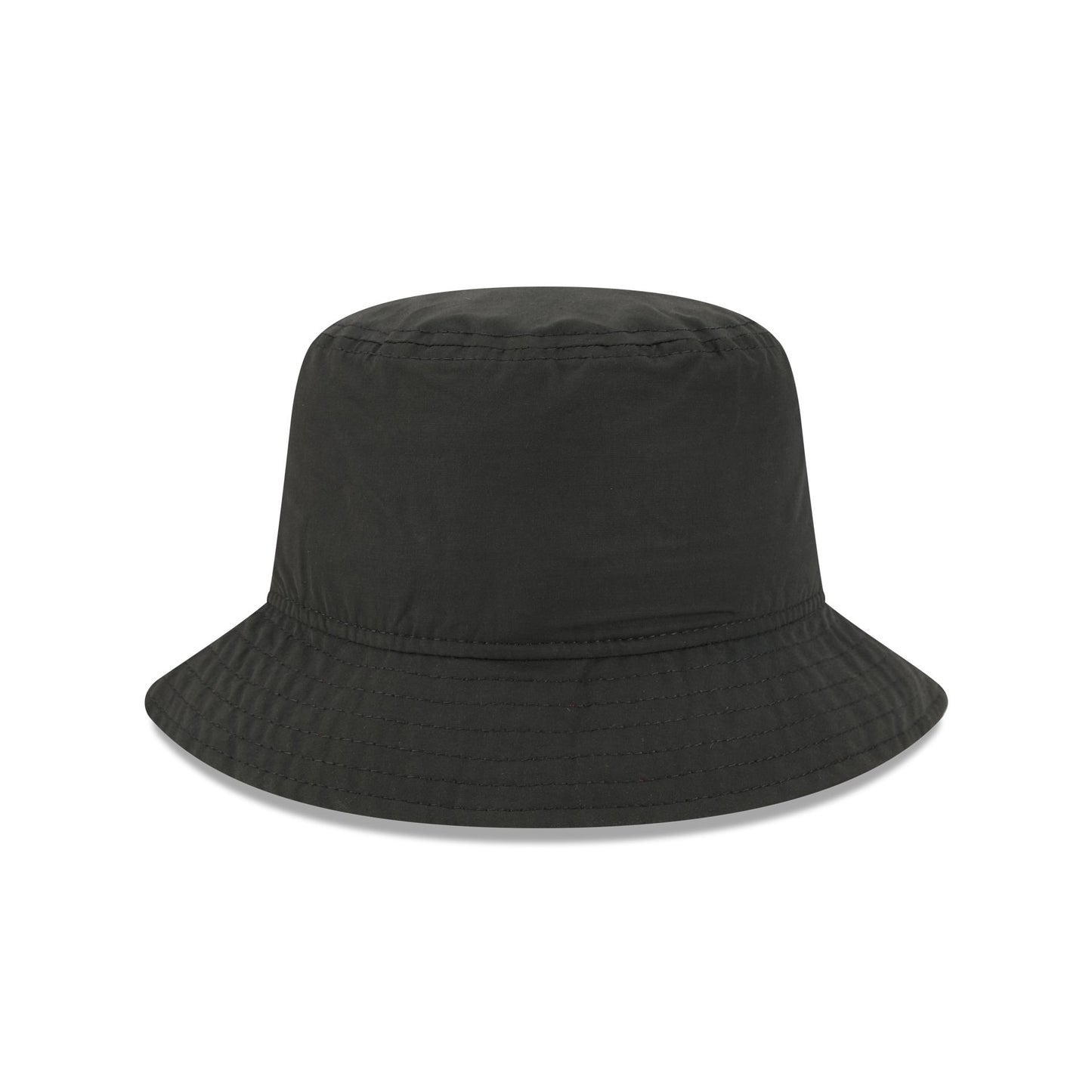 The Chicago Bulls Nylon Logo Bucket Hat features an embroidered Bulls logo, establishment date, and NBA Logoman at the front.