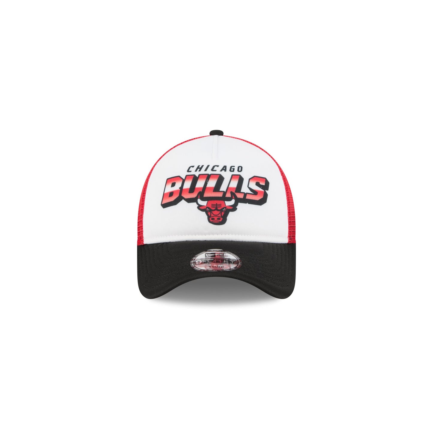 The Chicago Bulls Shine Kids 9FORTY A-Frame Trucker features a screen-printed Bulls graphic at the front panels with an adjustable snapback closure at a mesh rear.