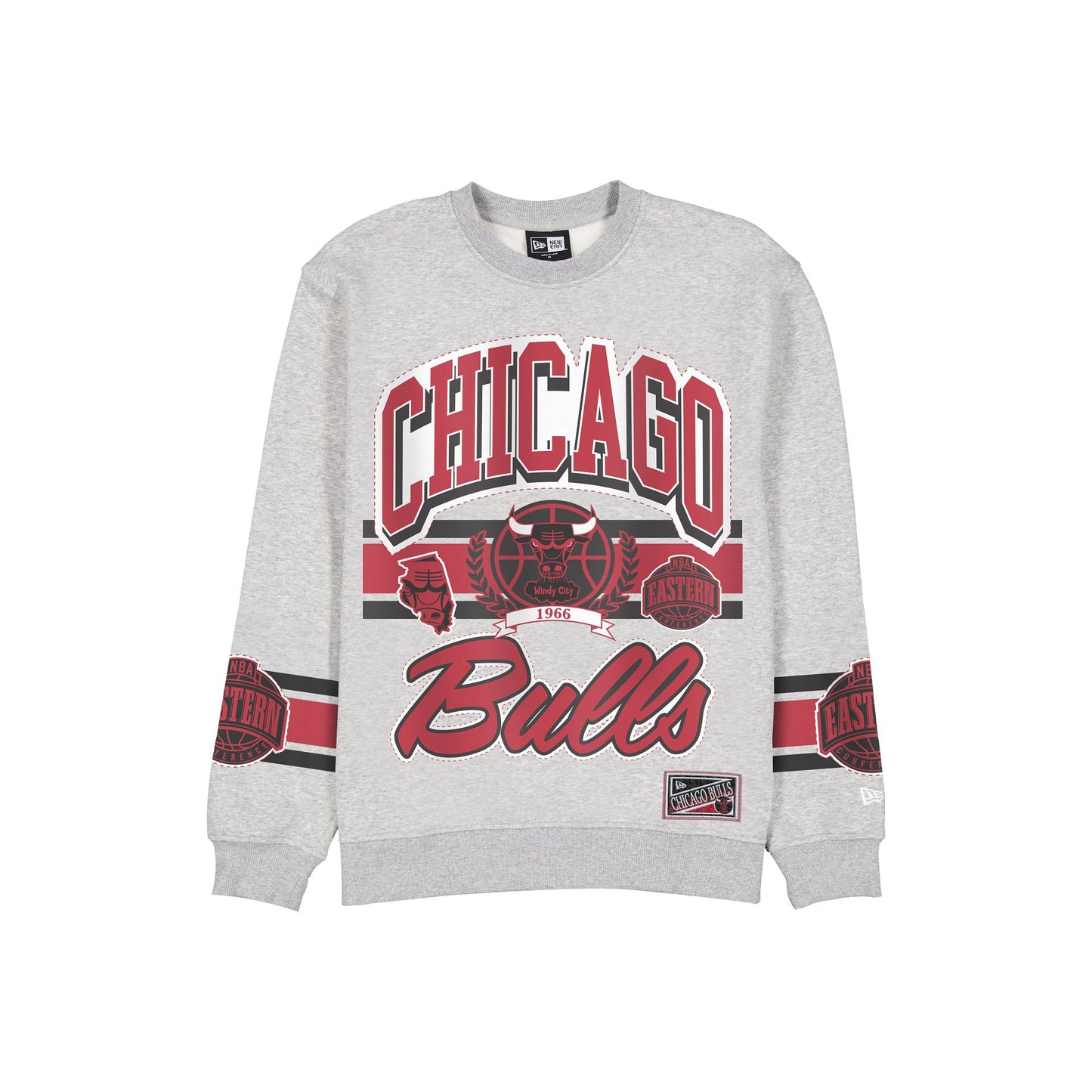 The Chicago Bulls Sport Classics Vintage Gray Oversized Crewneck features a screen-printed Bulls wordmark and graphic at the front with woven team jocktag at the bottom hem. Additional details include a Western Conference logo with team color stripes at the sleeves.