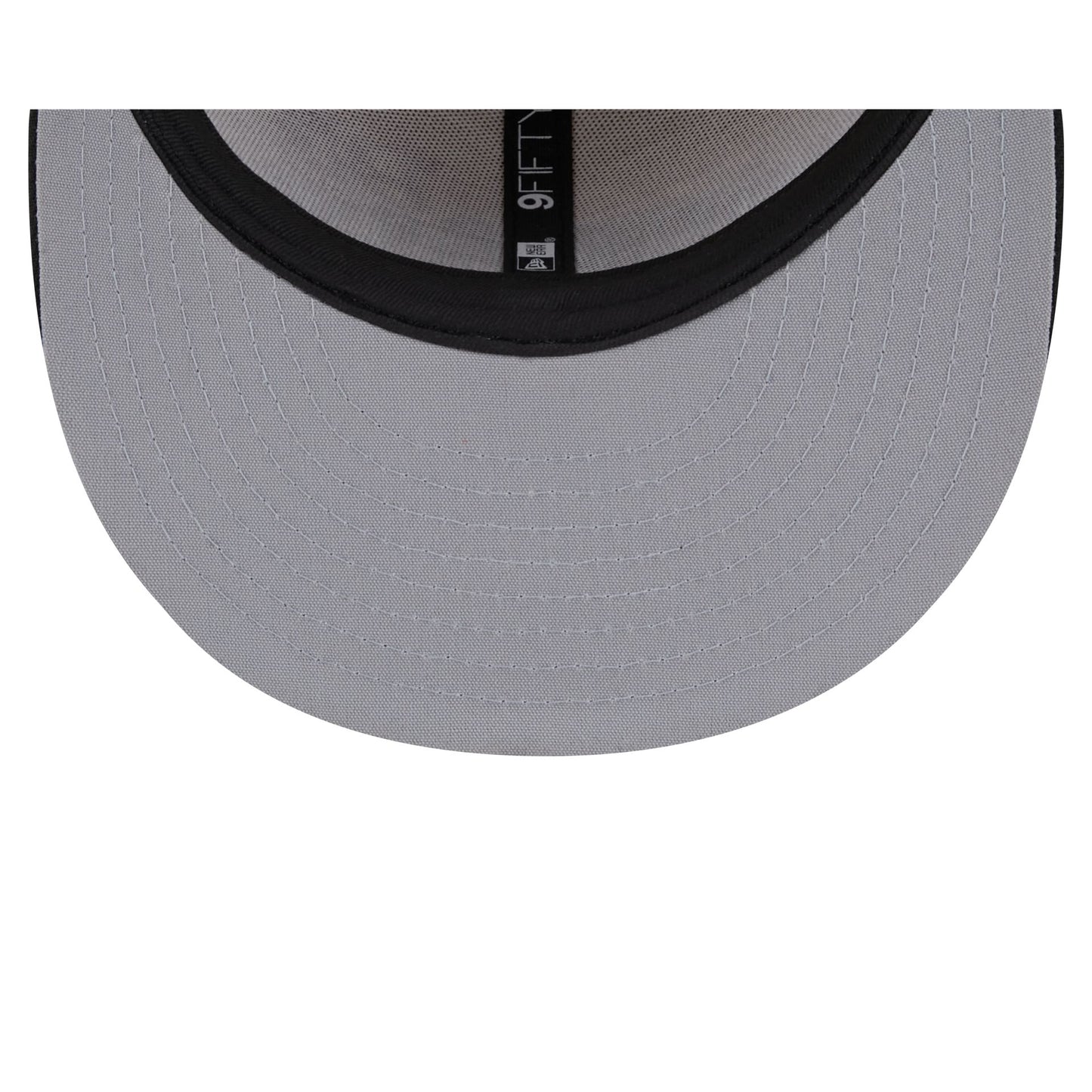 The Chicago Bulls Team Art 9FIFTY Snapback features an embroidered Bulls wordmark at the front panels with art. Additional details include a team wordmark above a snapback closure at the rear and a gray undervisor.