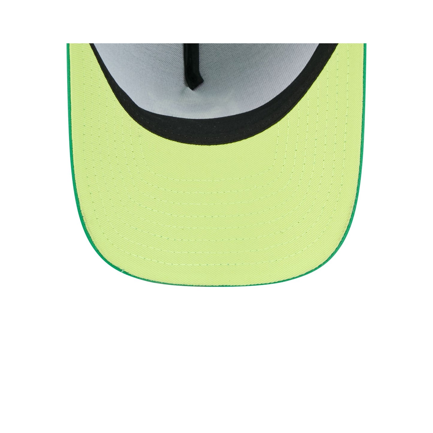 The Chicago Bulls Tee Time 9FORTY M-Crown A-Frame Snapback features an embroidered Bulls golf logo at the front panels with a snapback closure at the rear and a neon green undervisor.