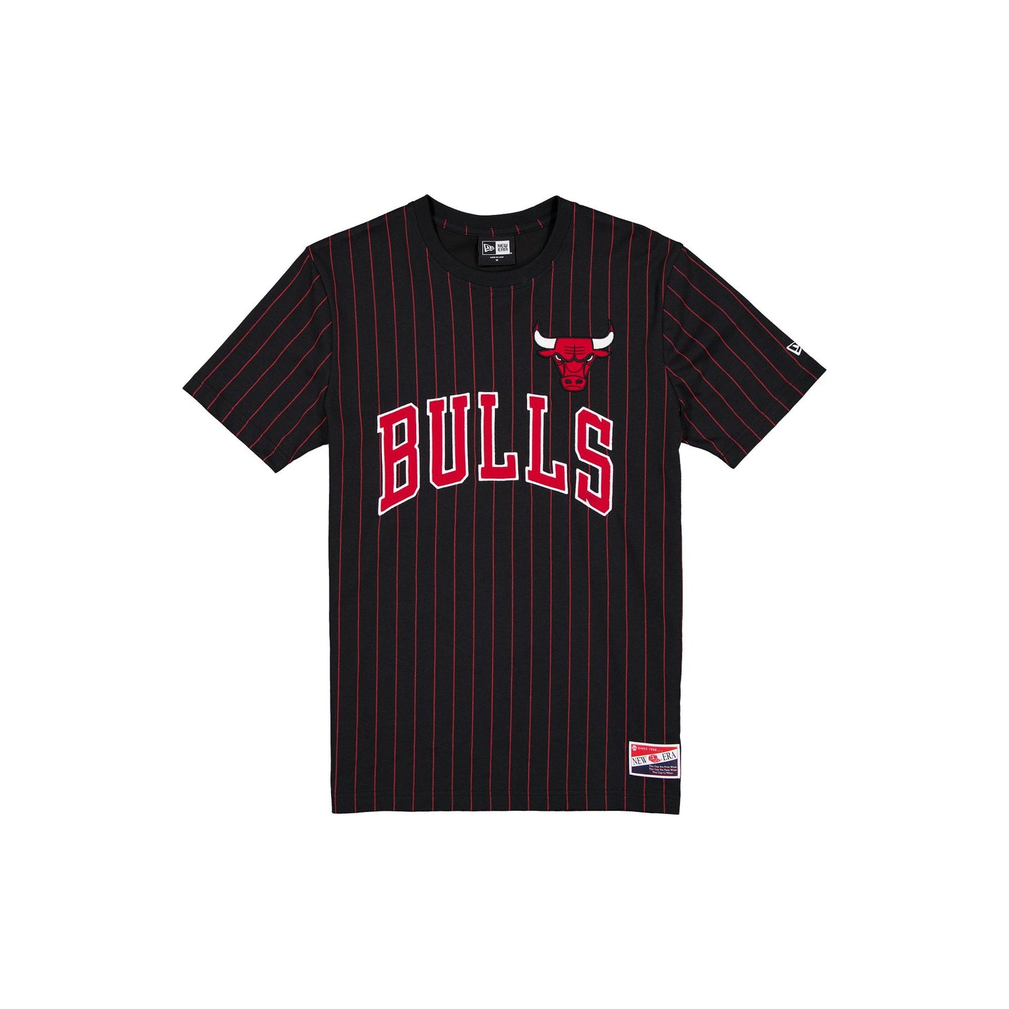 The Chicago Bulls Throwback Applique Pinstripe T-Shirt features a twill applique Bulls wordmark and logo at the front with a woven New Era jock tag at the left hip.