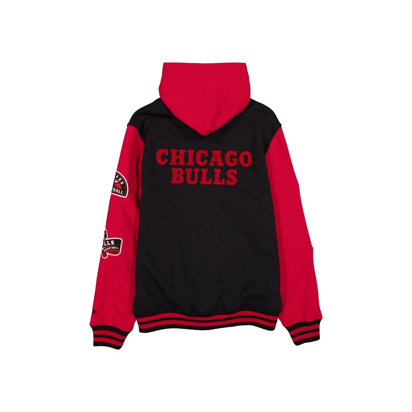 The Chicago Bulls Throwback Patch Jacket features an embroidered chenille felt Bulls logo at the left chest and wordmark at the rear with a New Era jock tag at the left hip. Additional details include embroidered team patches at each sleeve, front pockets, a snap button closure, and a hood.