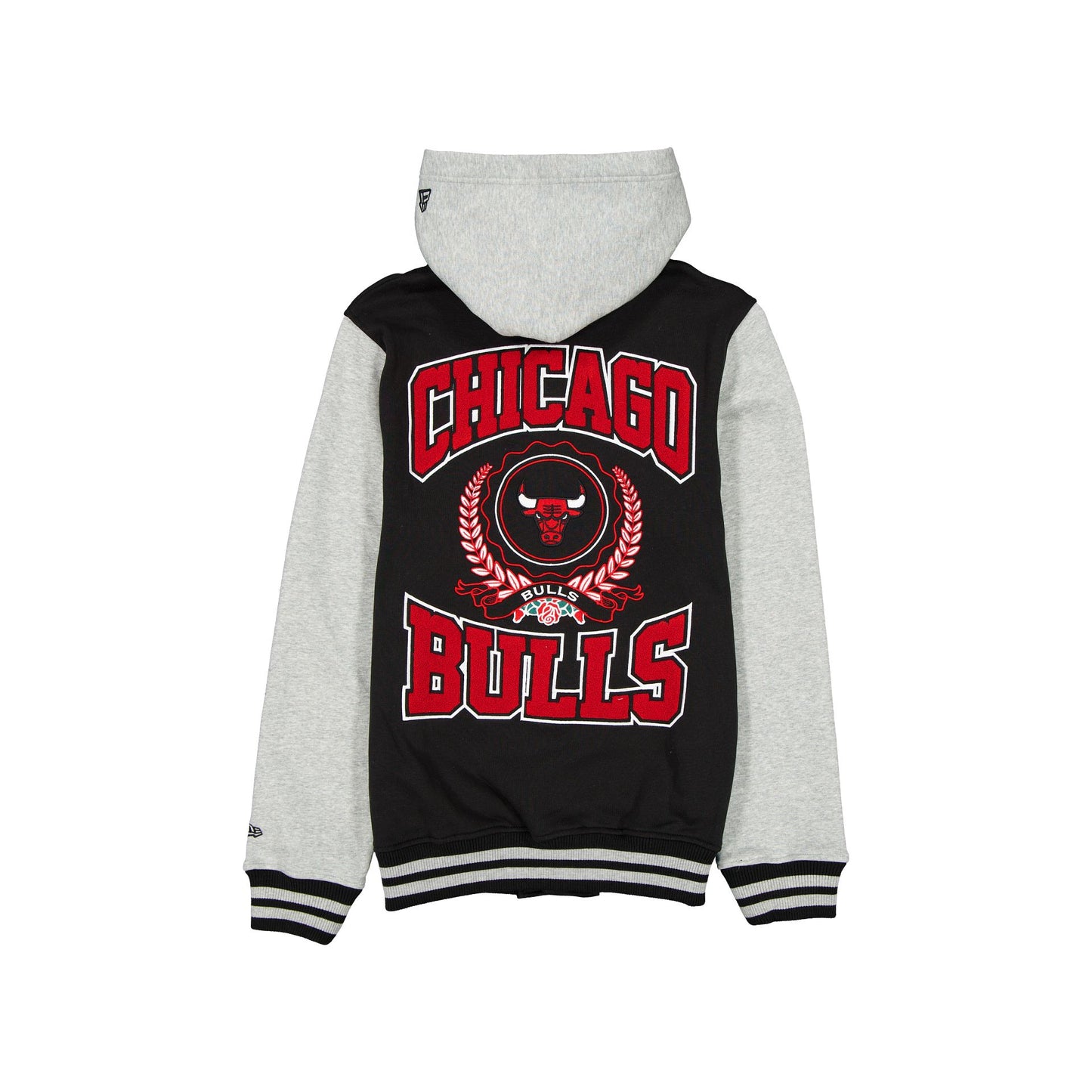 The Chicago Bulls Throwback Prep Jacket features a chain-stitched Bulls script at the right chest with a chenille applique team logo at the left chest. Additional details include a snap front closure with a chenille applique wordmark and team emblem at the rear.