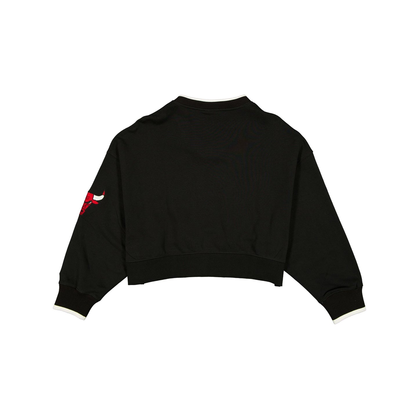 The Chicago Bulls Throwback Prep Women's Cropped Crewneck features a screen-printed Bulls wordmark at the chest with an embroidered script wordmark below. Additional details include an embroidered logo at the left arm and a cropped fit.