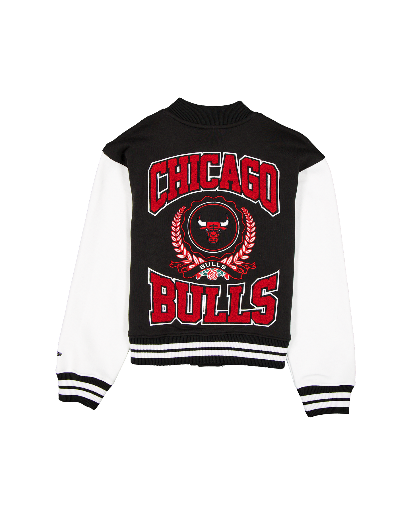 The Chicago Bulls Throwback Prep Women's Jacket features a chain-stitched Bulls script at the left chest with a snap front closure and a chenille applique wordmark with team emblem at the rear.