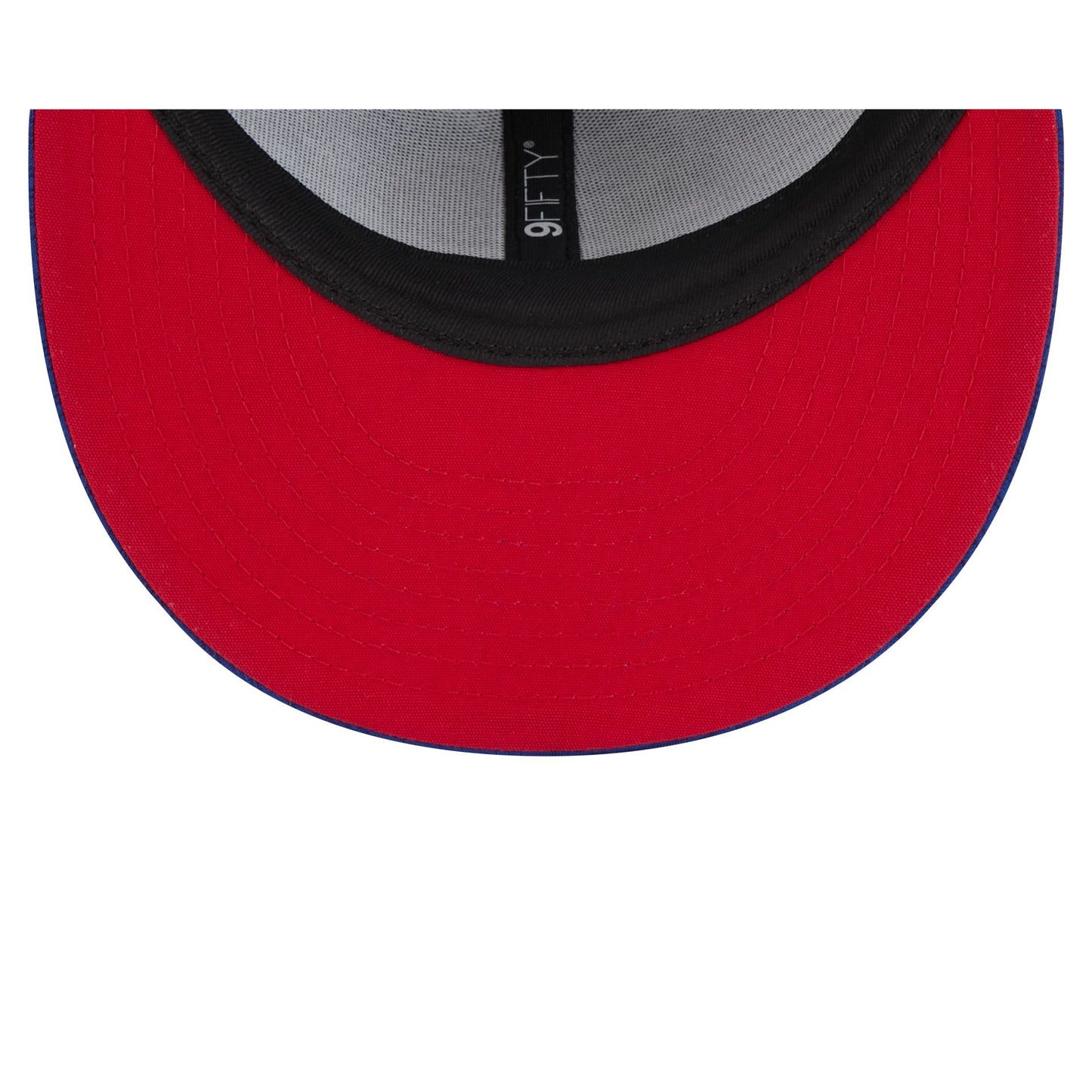 The Chicago Cubs 2024 Clubhouse Alt 9FIFTY Snapback features a layered Cubs logo patch and stitching details at the front panels with a snapback at the rear and a red undervisor.