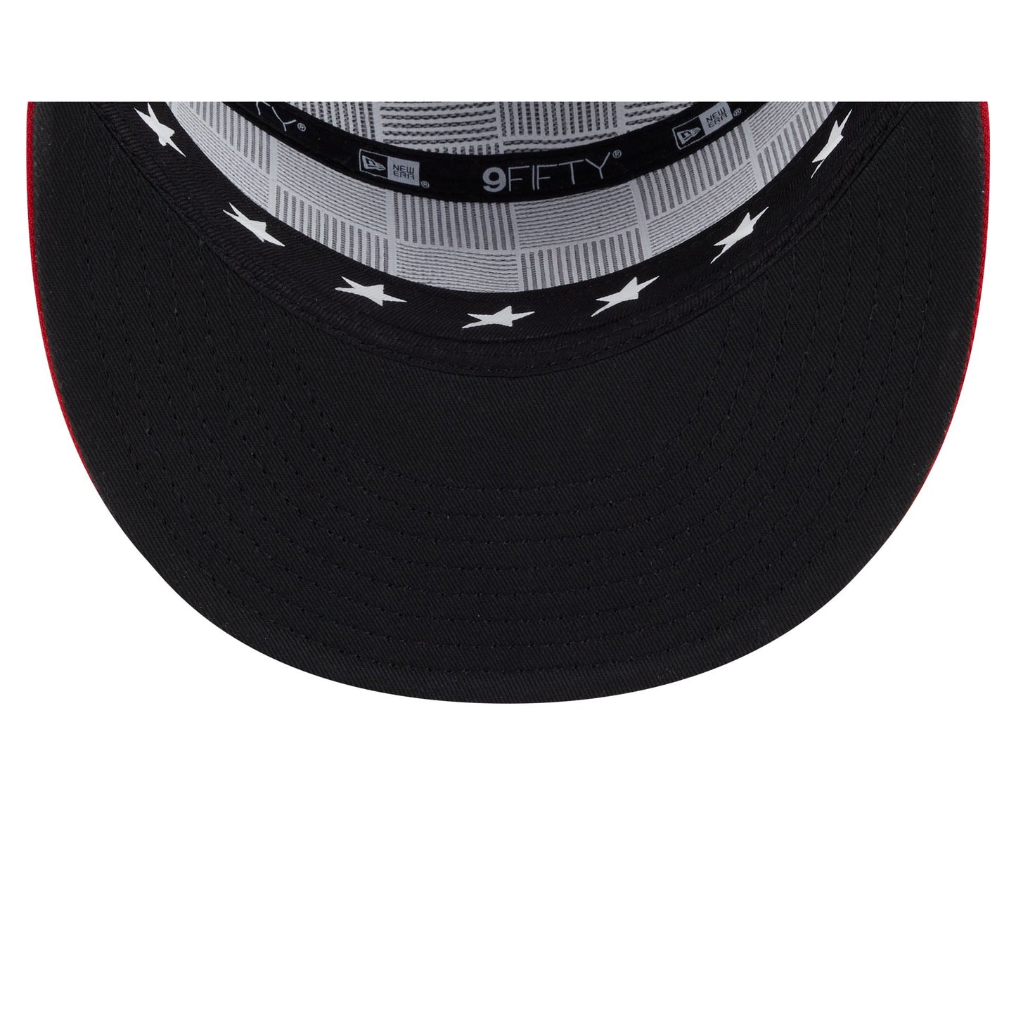 The Chicago Cubs 2025 All-Star Game Split Panel 9FIFTY Snapback features an embroidered Cubs logo at the front panels against a split-crown construction with breathable mesh fabric at the side and rear panels. Additional details include stars at the top panel, a 2025 All-Star Game patch at the right-wear side, the MLB Batterman logo above a snapback closure at the rear, and a black undervisor. The cap also features screen-printed stars on the sweatband.