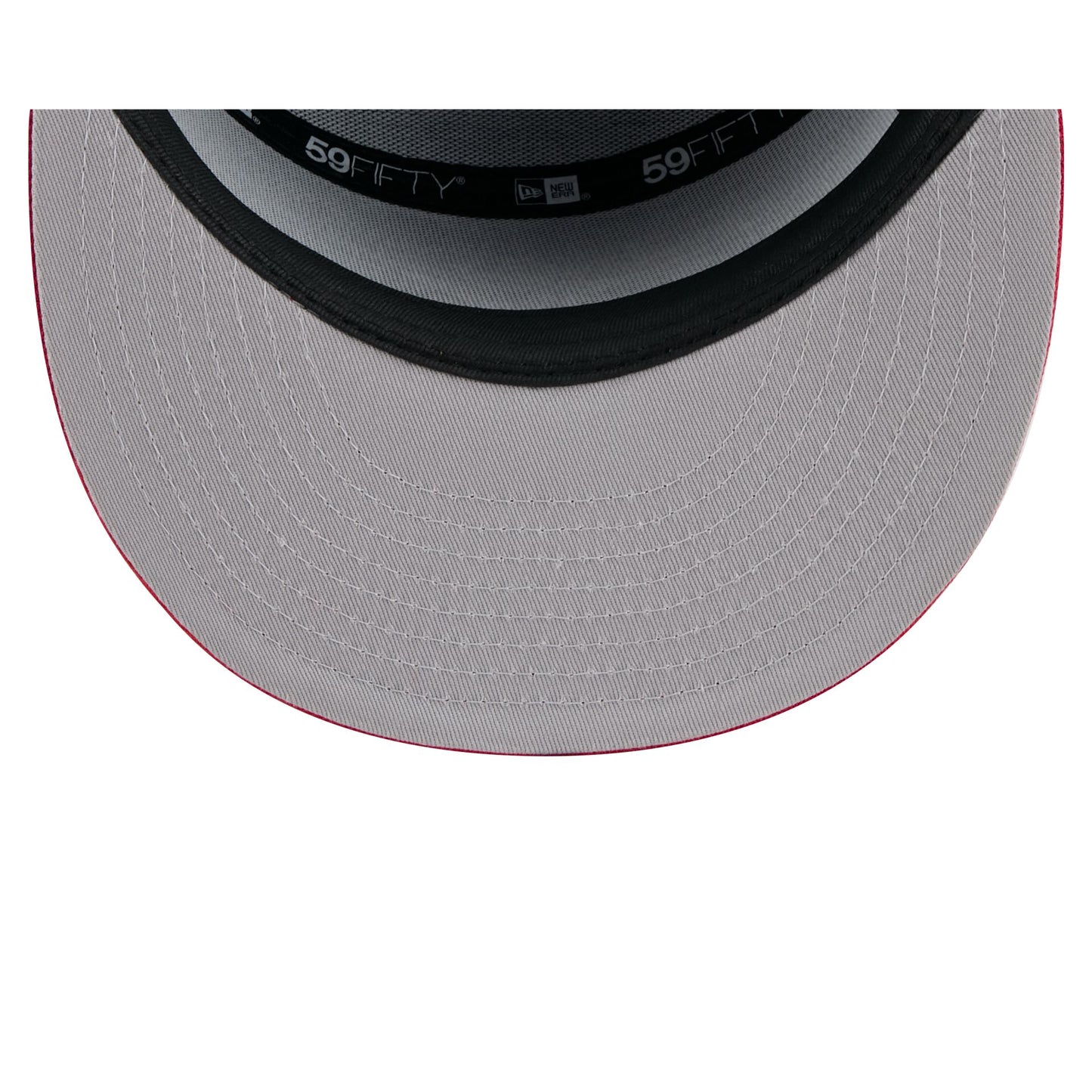 The Chicago Cubs 2025 All-Star Game Workout Split Panel 59FIFTY Fitted Cap features an embroidered Cubs logo at the front panels against a split-crown construction with breathable mesh fabric at the side and rear panels. Additional details include stars at the top panel, a 2025 All-Star Game patch at the right-wear side, the MLB Batterman logo at the rear, and a gray undervisor.