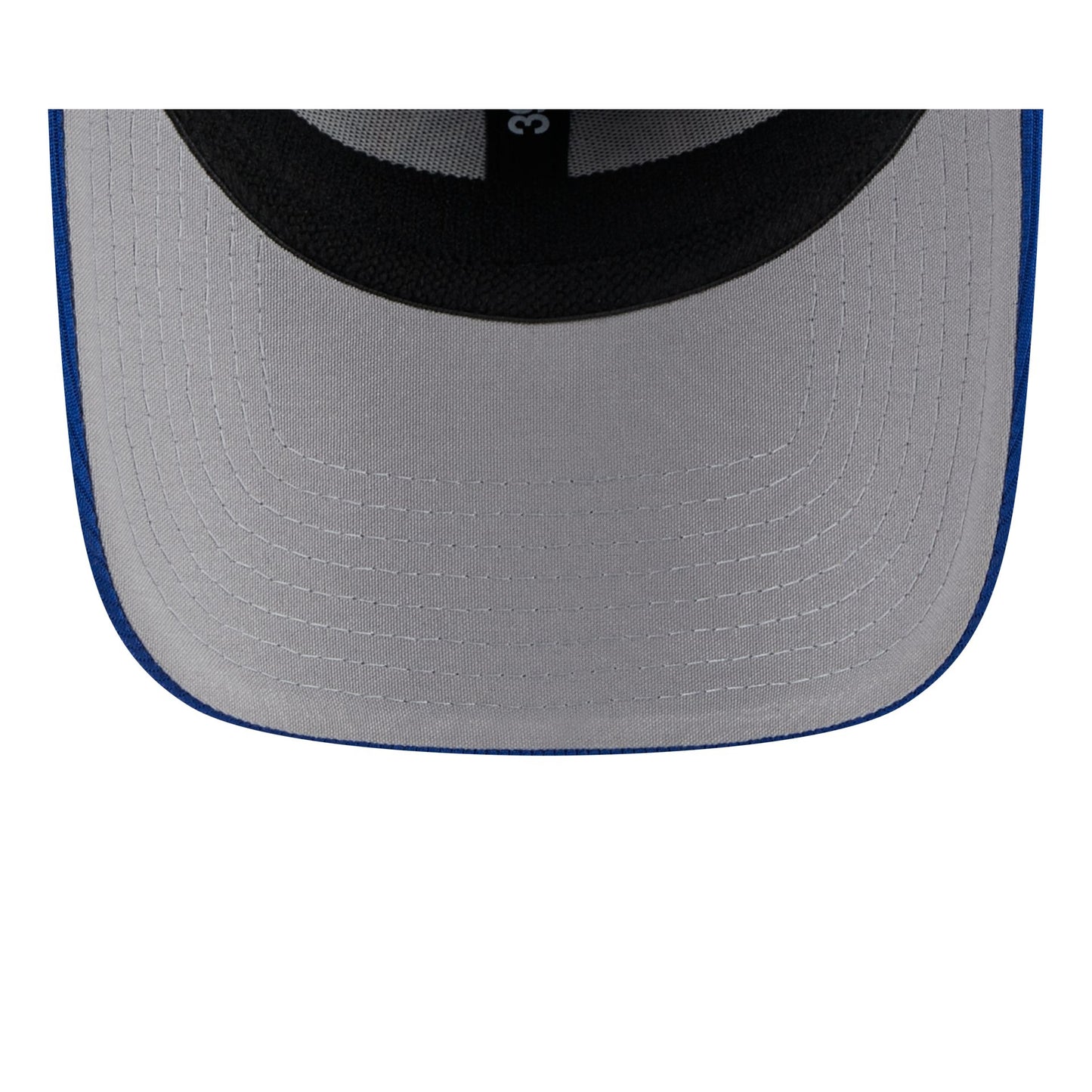 The Chicago Cubs 2025 Batting Practice 39THIRTY Stretch Fit Cap features an embroidered Cubs logo at the front panels with a matching team wordmark at the rear. Additional details include a pivot knit fabrication, a blue visor, and a gray undervisor.