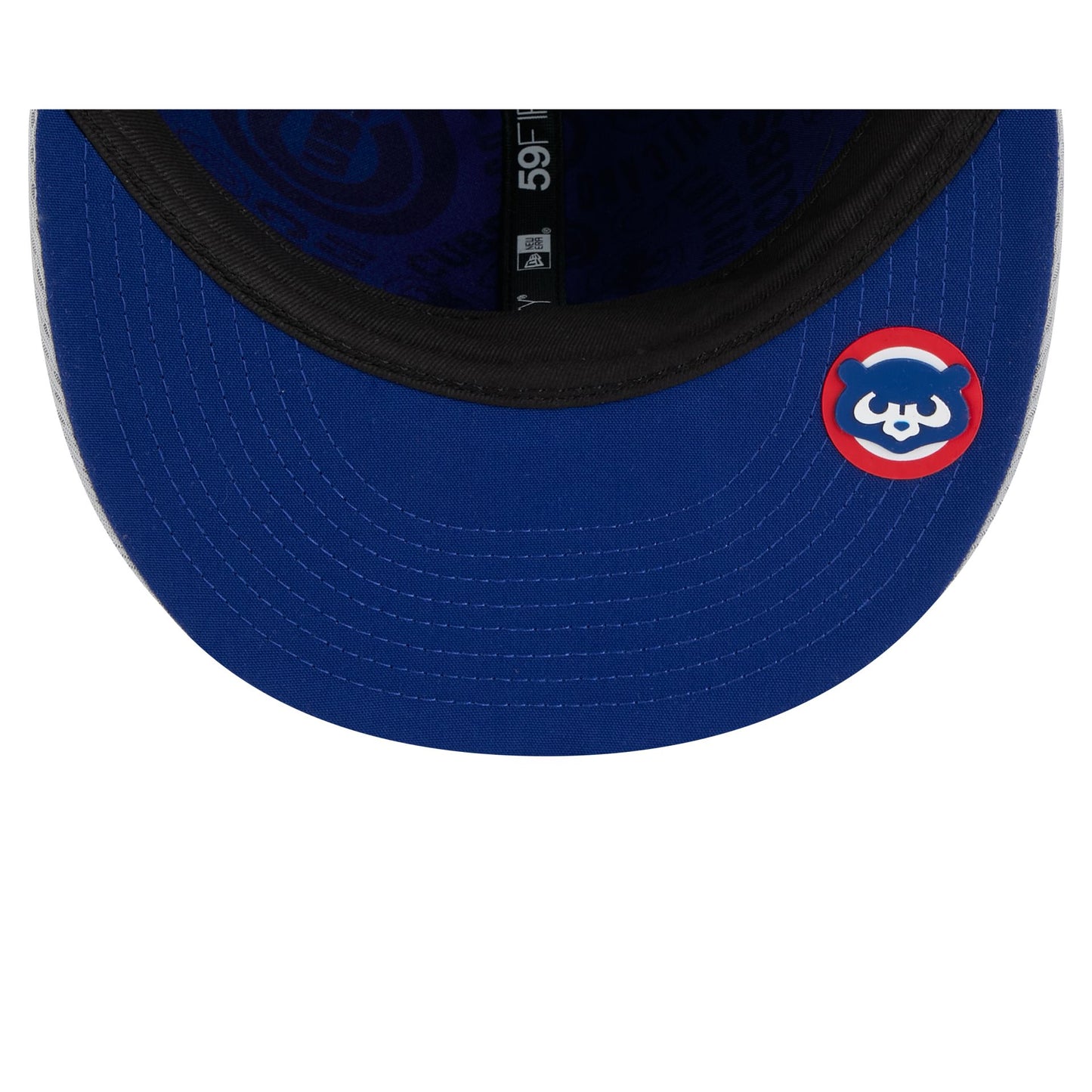 The Chicago Cubs 2025 Clubhouse Gray F9FIFTY Fitted Cap features an embroidered Cubs logo at the front panels with a matching MLB Batterman logo at the rear and a dashmark mesh fabrication throughout. Additional details include a silicone team tag on the right-wear side and team logo on the undervisor.