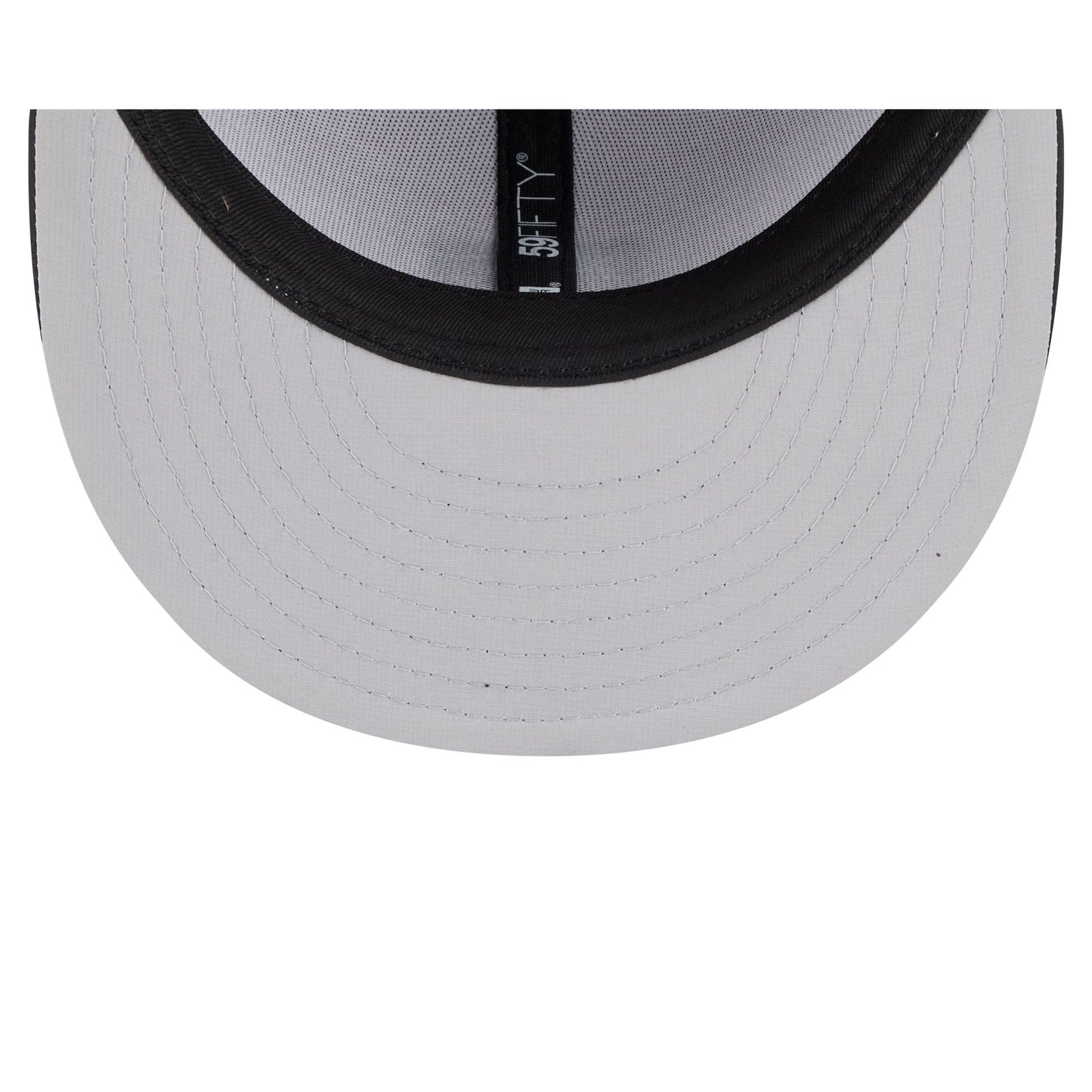 The Chicago Cubs 2026 Clubhouse Black & White 59FIFTY Fitted Cap features a sewn-down silicone Cubs logo patch at the front panels with a water-repellent quill tech fabrication throughout. Additional details include a silicone MLB Batterman logo patch at the rear and a gray undervisor. The visor is accented with a silicone transfer team patch.