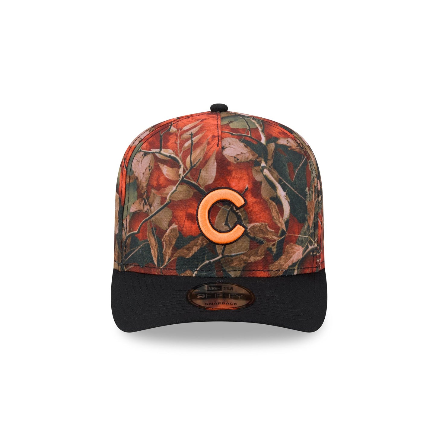 The Chicago Cubs Amber Leaves 9FIFTY A-Frame Snapback features an embroidered Cubs logo at the front panels against a forest nature pattern throughout. Additional details include a team patch at the right-wear side, an adjustable snapback closure at the rear, and a gray undervisor.