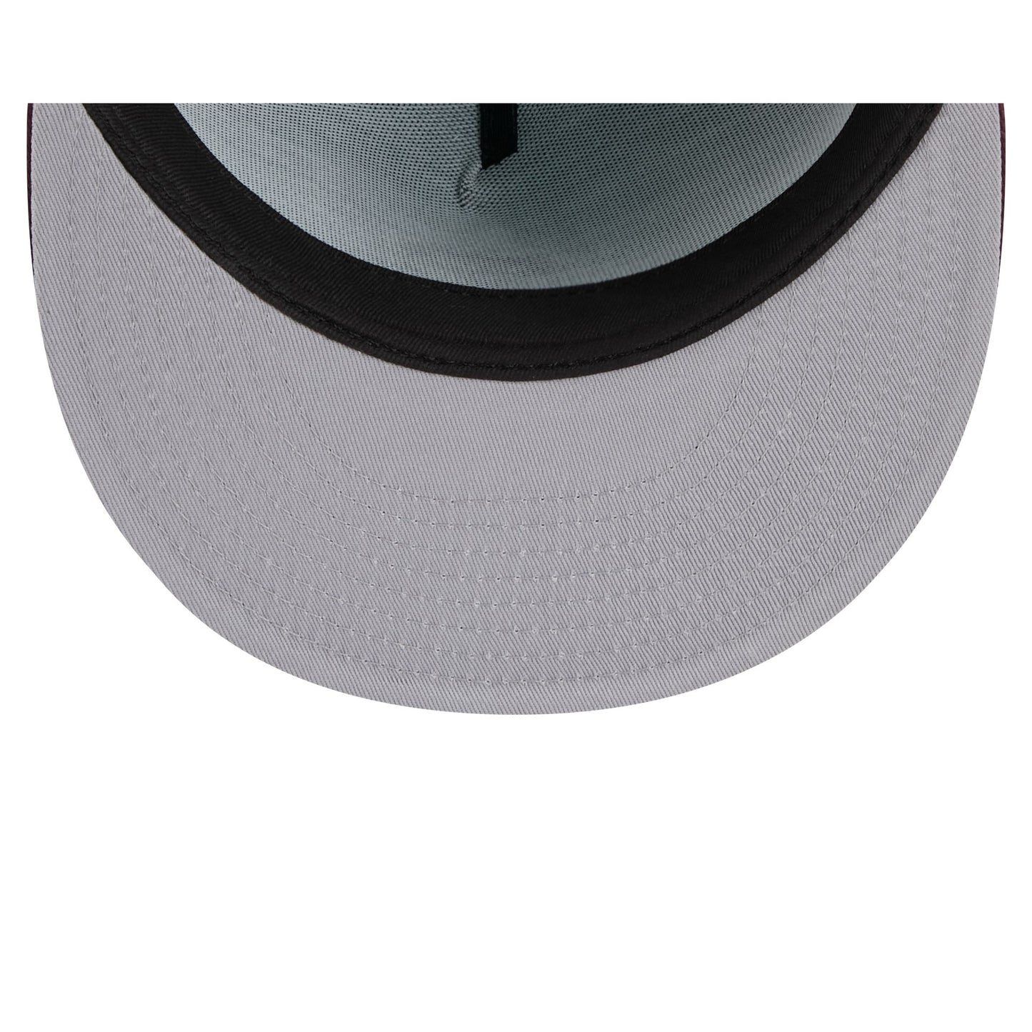 The Chicago Cubs Beach Kiss Blue 59FIFTY A-Frame Fitted Cap features an embroidered Cubs logo at the front panels with a matching MLB Batterman logo at the rear. Additional details include a Wrigley Field patch at the right-wear side and a gray undervisor.