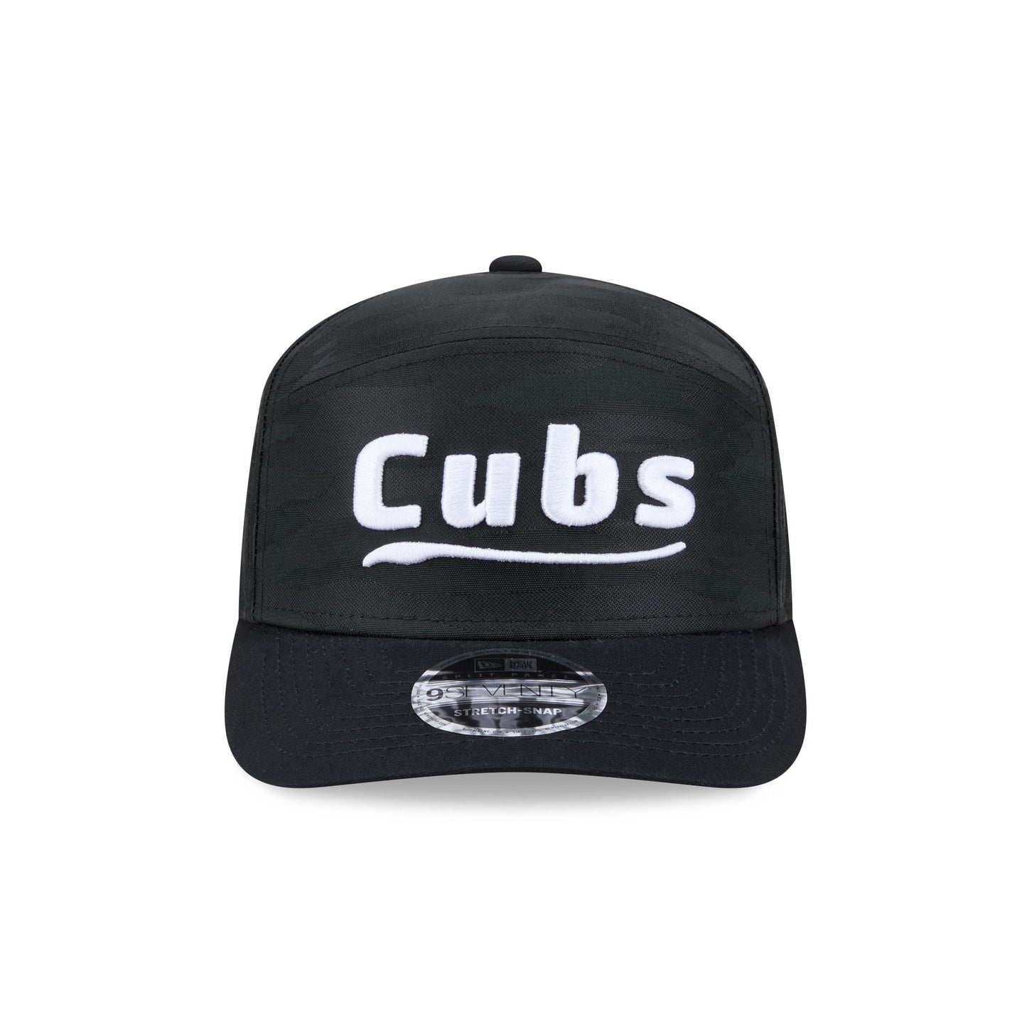 The Chicago Cubs Black Camo Split Panel 9SEVENTY Stretch-Snap features an embroidered Cubs white wordmark at the front panel with a split crown construction and a team logo at the right-wear side. Additional details include a black camo print throughout, an adjustable stretch-snap closure at the rear, and a gray undervisor.