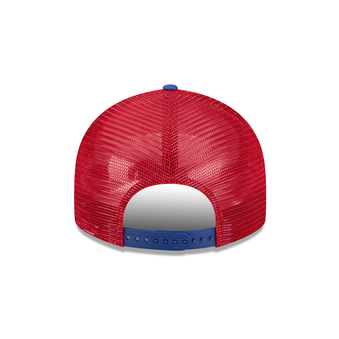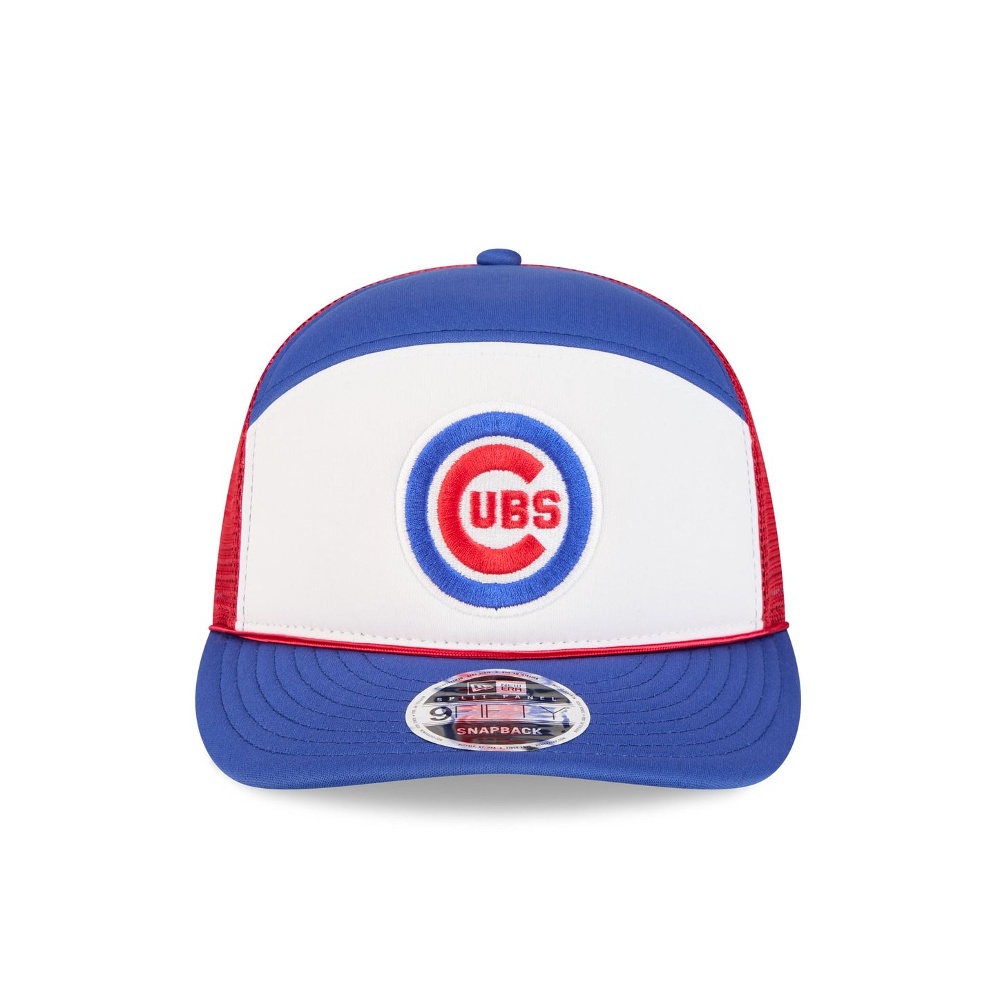 The Chicago Cubs Blocked Split Panel 9FIFTY Trucker features an embroidered Cubs logo at the front panel with a split-crown construction. Additional details include an adjustable snapback closure at a mesh rear and a gray undervisor.