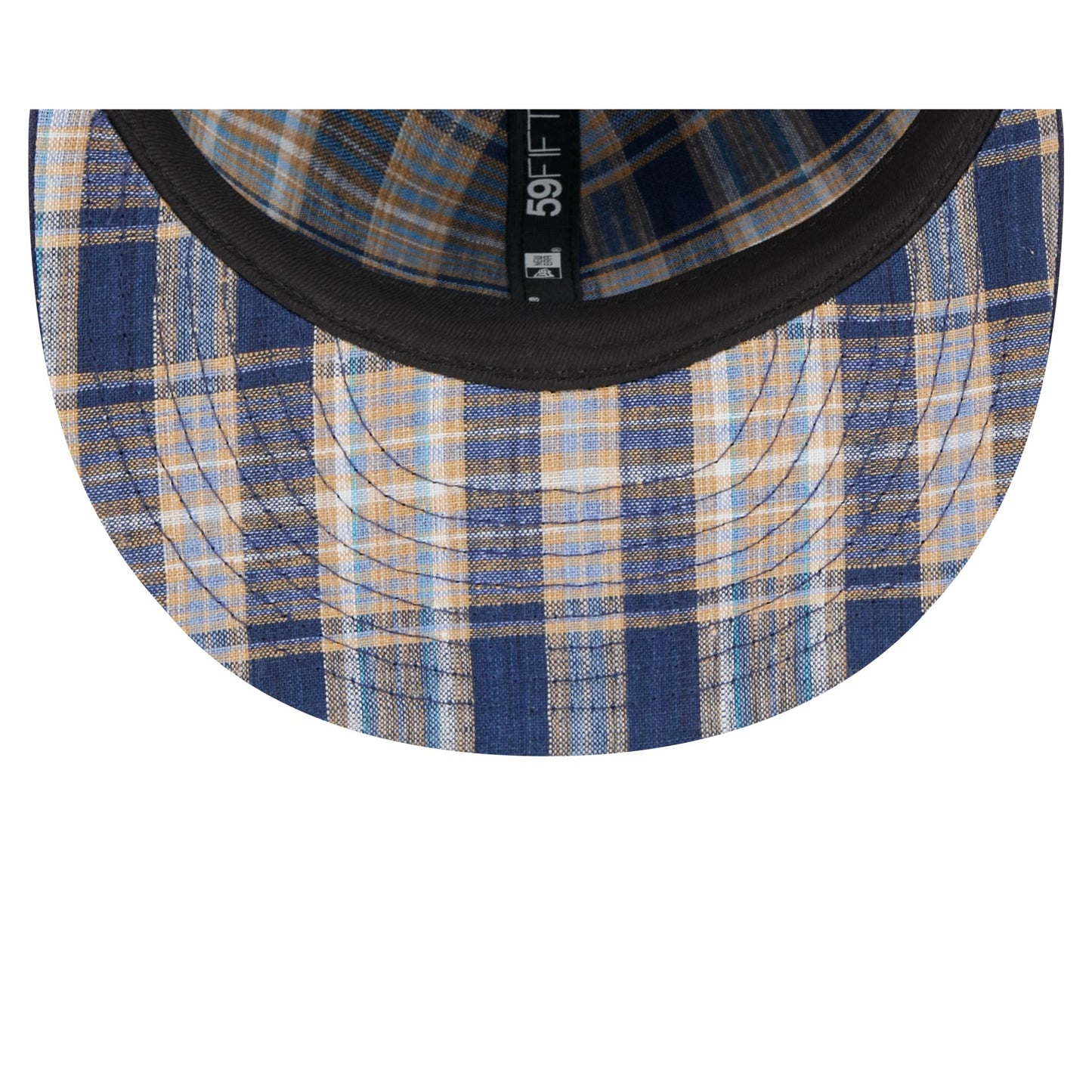 The Chicago Cubs Blue Tartan 59FIFTY Fitted Cap features an embroidered Cubs logo at the front panels with a matching MLB Batterman logo at the rear. Additional details include a plaid team patch at the right-wear side and a plaid undervisor.