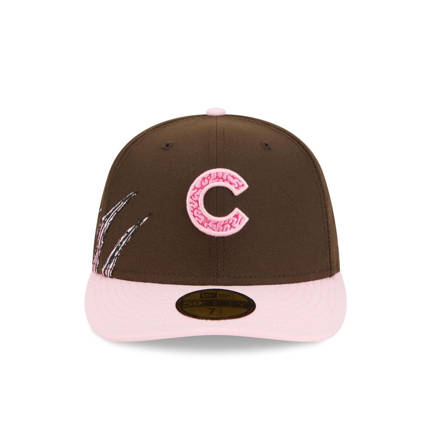 The Chicago Cubs Brains 59FIFTY Fitted Cap features an embroidered brain themed Cubs logo at the front panels with a matching MLB Batterman logo at the rear. Additional details include scratch details at the right-wear side with a light pink visor and a gray undervisor. This cap comes with a pre-curved visor.