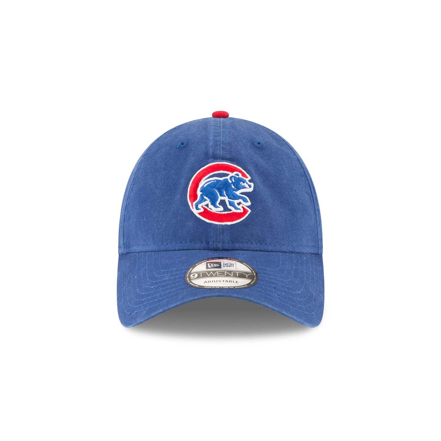 The Chicago Cubs Chicago Cubs Core Classic Replica Bear 9TWENTY Adjustable Cap features an embroidered Cubs logo at the front panels with a woven tab displaying the team logo on a D-Ring closure at the rear.