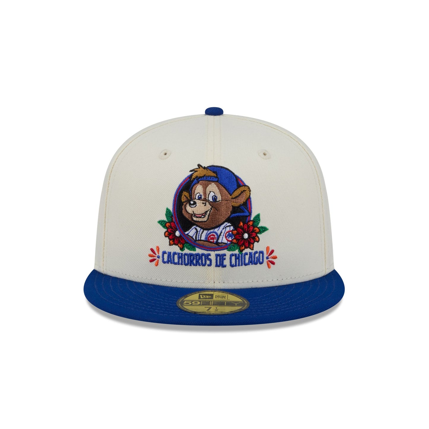 The Chicago Cubs Day of the Dead Sugar Skull Mascot 59FIFTY Fitted Cap features an embroidered Cubs Mascot with flowers at the front panels with a skeletal mascot at the right-wear side. Additional details include the MLB Batterman logo at the rear and a green undervisor.