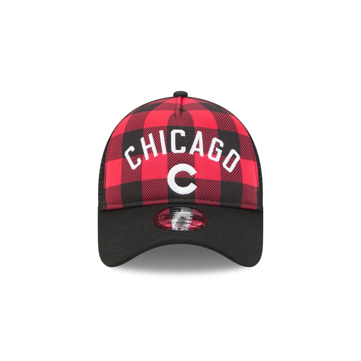 The Chicago Cubs Evergreen Check 9FORTY A-Frame Trucker features an embroidered Cubs white wordmark and logo at a checkered plaid front panel. Additional details include an adjustable snapback closure at a mesh rear.