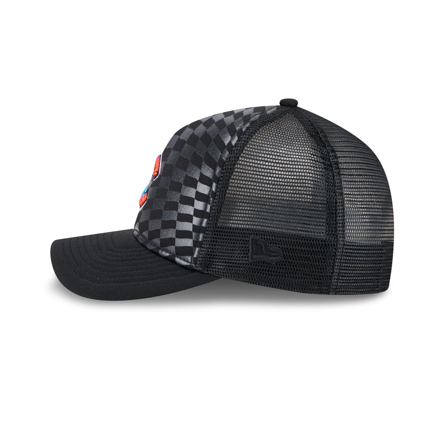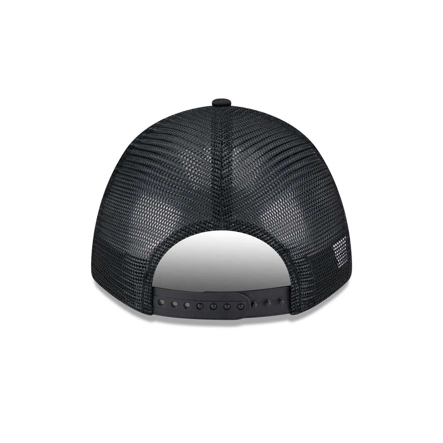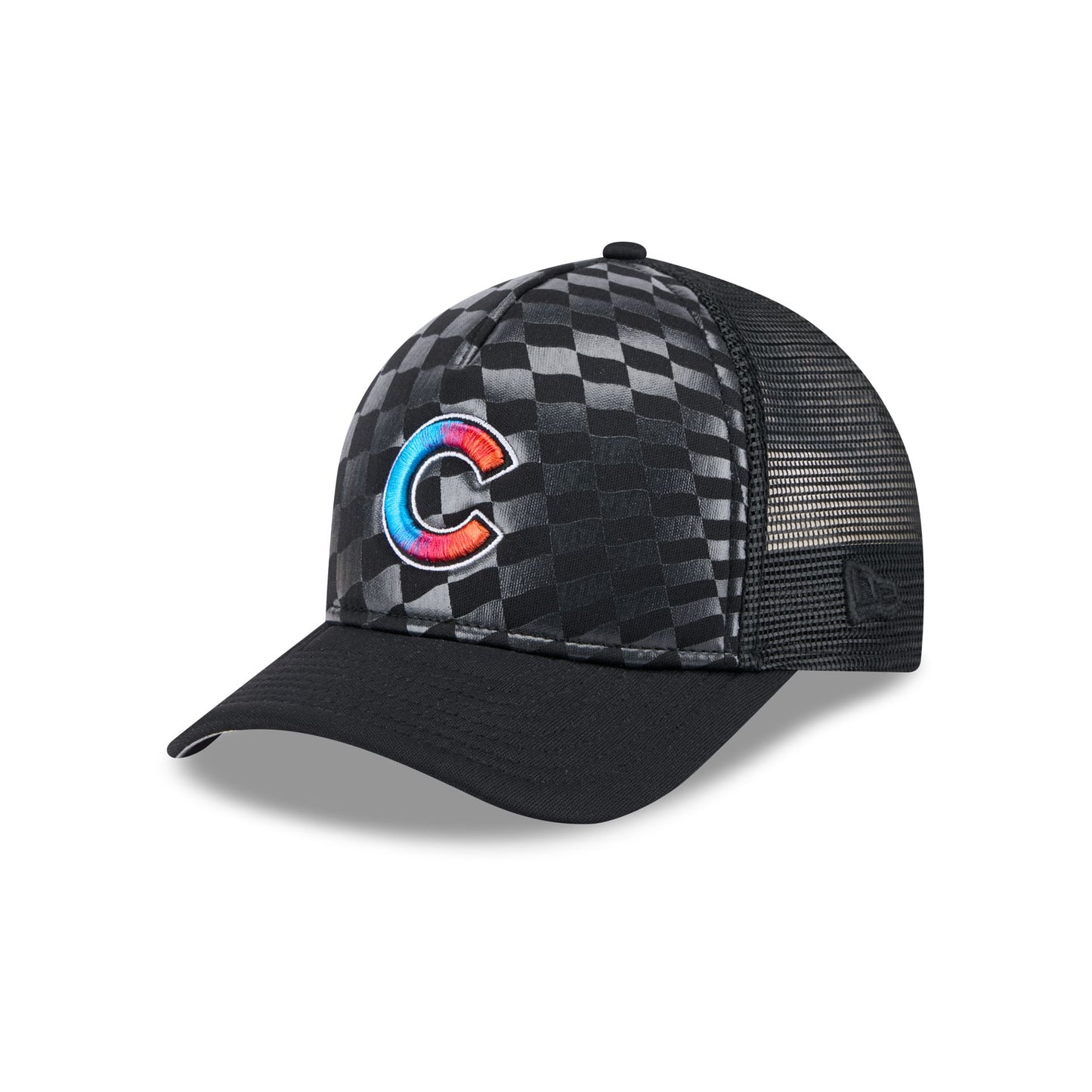 The Chicago Cubs Gradient Raceway 9FORTY M-Crown A-Frame Trucker features an embroidered Cubs gradient logo at the front panels with a snapback closure at a mesh rear and a gray undervisor.