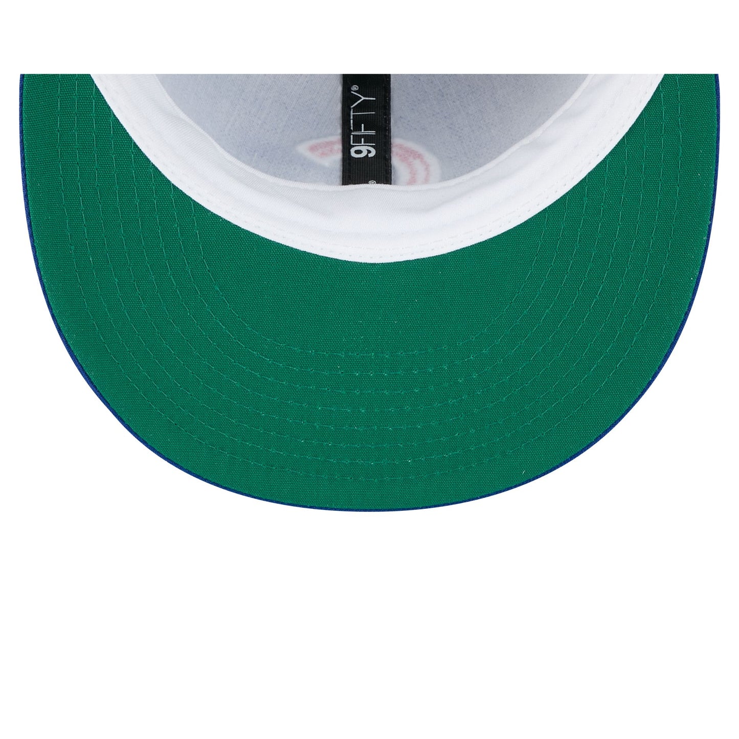 The Chicago Cubs Hall of Fame 2025 Retro Crown 9FIFTY Snapback features an embroidered Cubs Cooperstown logo at the front panels with a matching MLB Batterman logo above a snapback closure at the rear, a National Baseball Hall of Fame patch at the right-wear side, and a green undervisor.