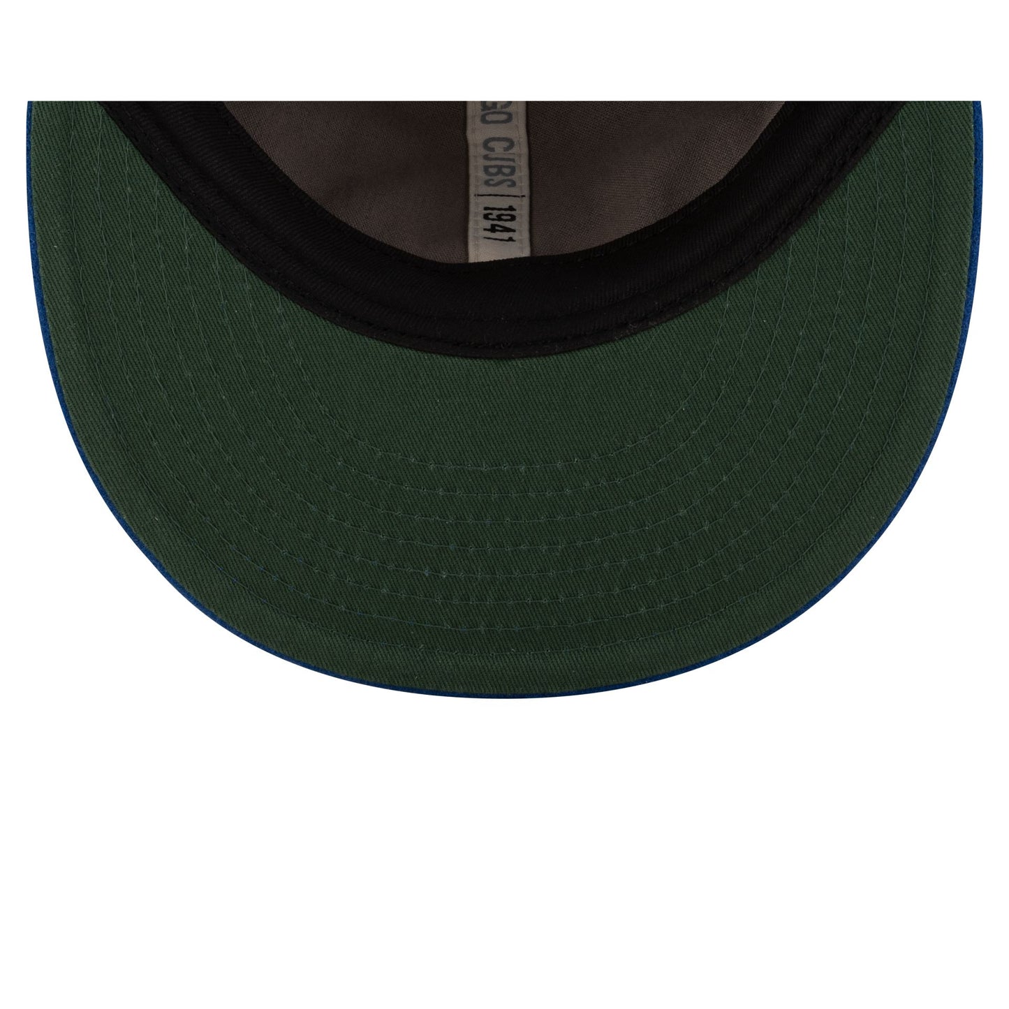 The Chicago Cubs Heritage Blue Retro Crown 9FIFTY Strapback Cap features an embroidered Cubs Cooperstown logo at the front panels with an adjustable D-Ring closure at the rear and a green undervisor.