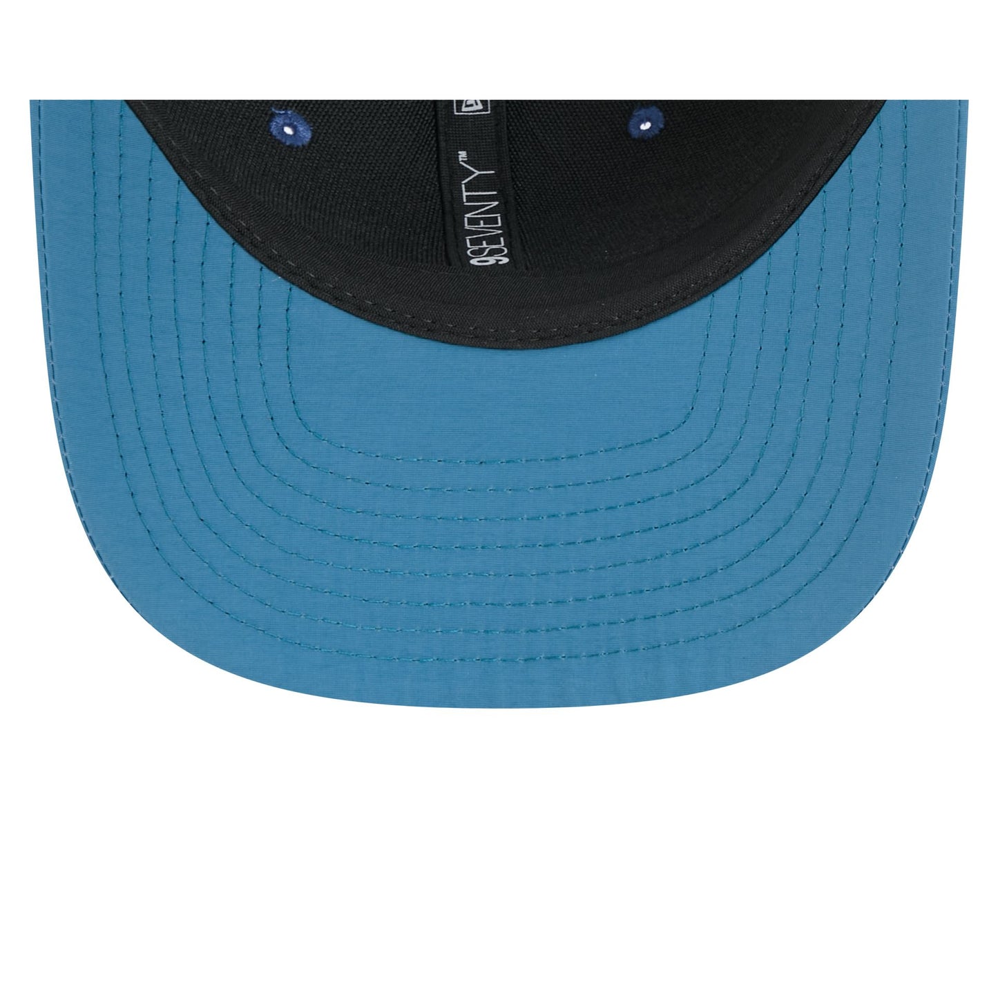 The Chicago Cubs Indigo 9SEVENTY Trucker features an embroidered Cubs wordmark patch at the front panels with a mesh back, a snapback closure at the rear, and a blue undervisor.