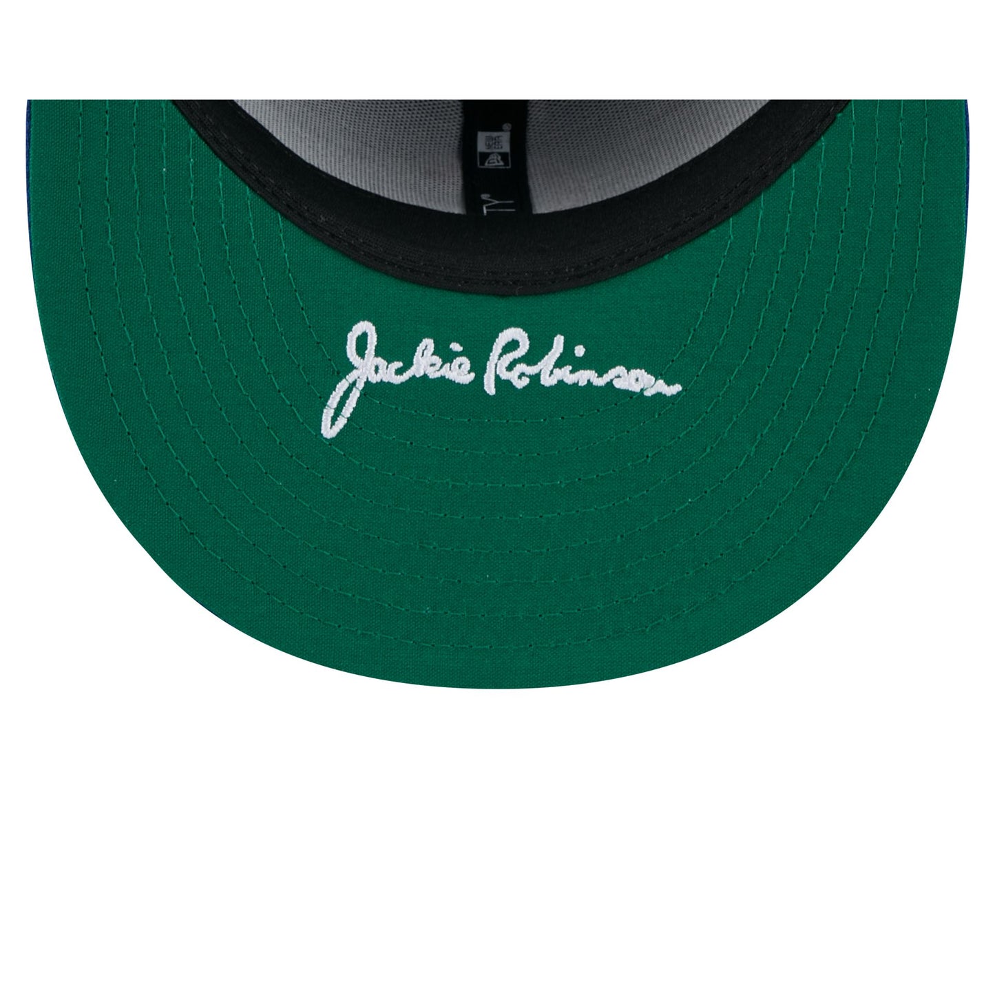 The Chicago Cubs Jackie Robinson Day 2025 59FIFTY Fitted Cap features an embroidered Cubs logo at the front panels with an MLB Batterman logo at the rear. Additional details include a Jackie Robinson Breaking Barriers patch at the right-wear side and Robinson's embroidered signature on a green undervisor.