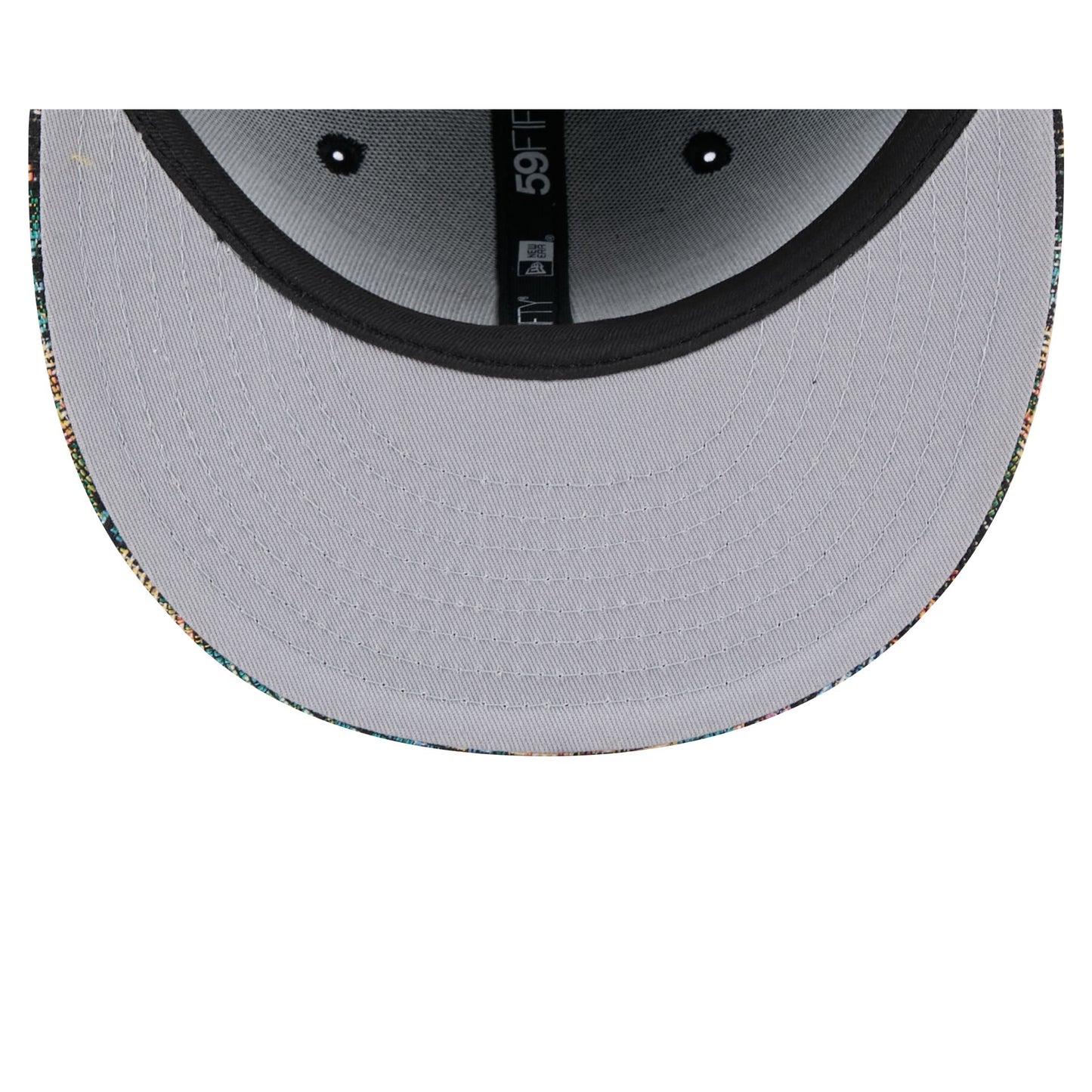 The Chicago Cubs Jacquard Pattern 59FIFTY Fitted Cap features an embroidered Cubs Cooperstown wordmark at the front panels with a matching MLB Batterman logo at the rear. Additional details include a floral jacquard pattern throughout and a gray undervisor.