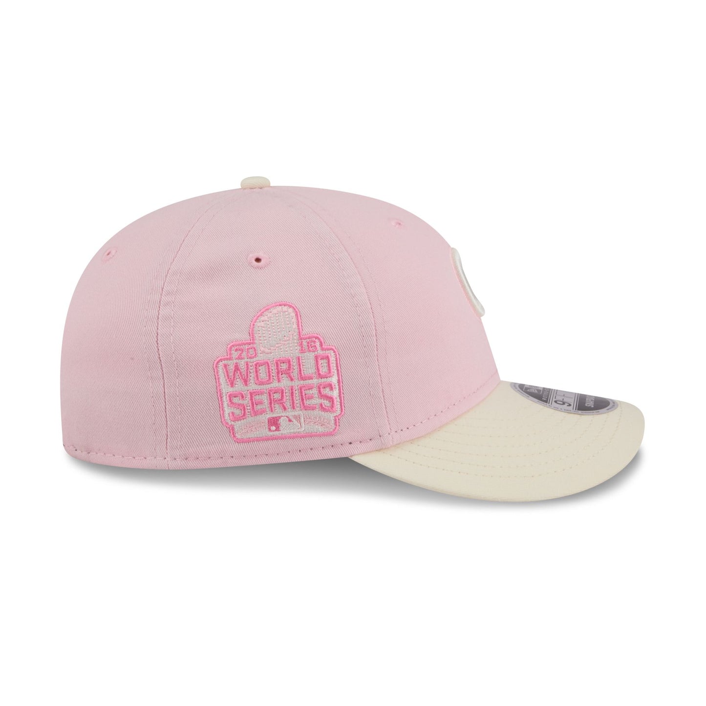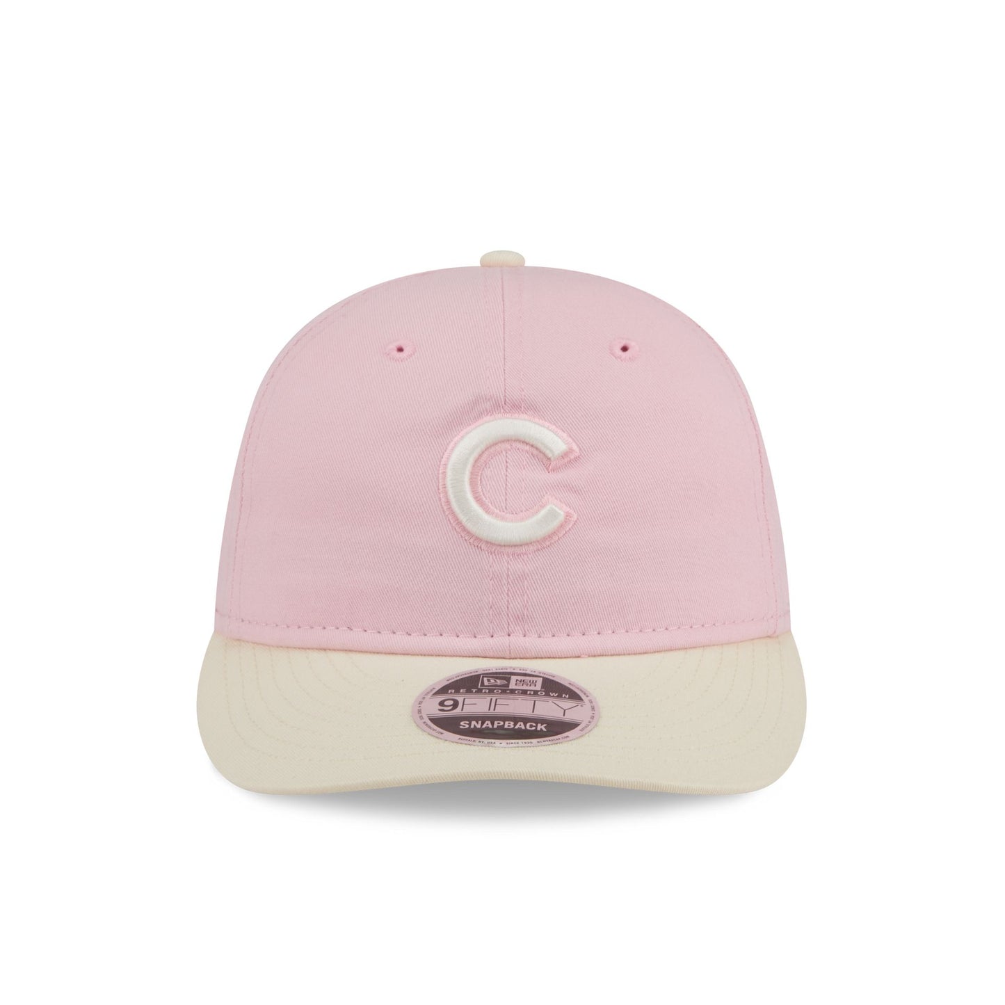 The Chicago Cubs Light Pink 9FIFTY Snapback features an embroidered Cubs logo at the front panels with a 2016 World Series patch at the right-wear side. Additional details include an adjustable heart-shaped snapback closure at the rear and a pink undervisor.