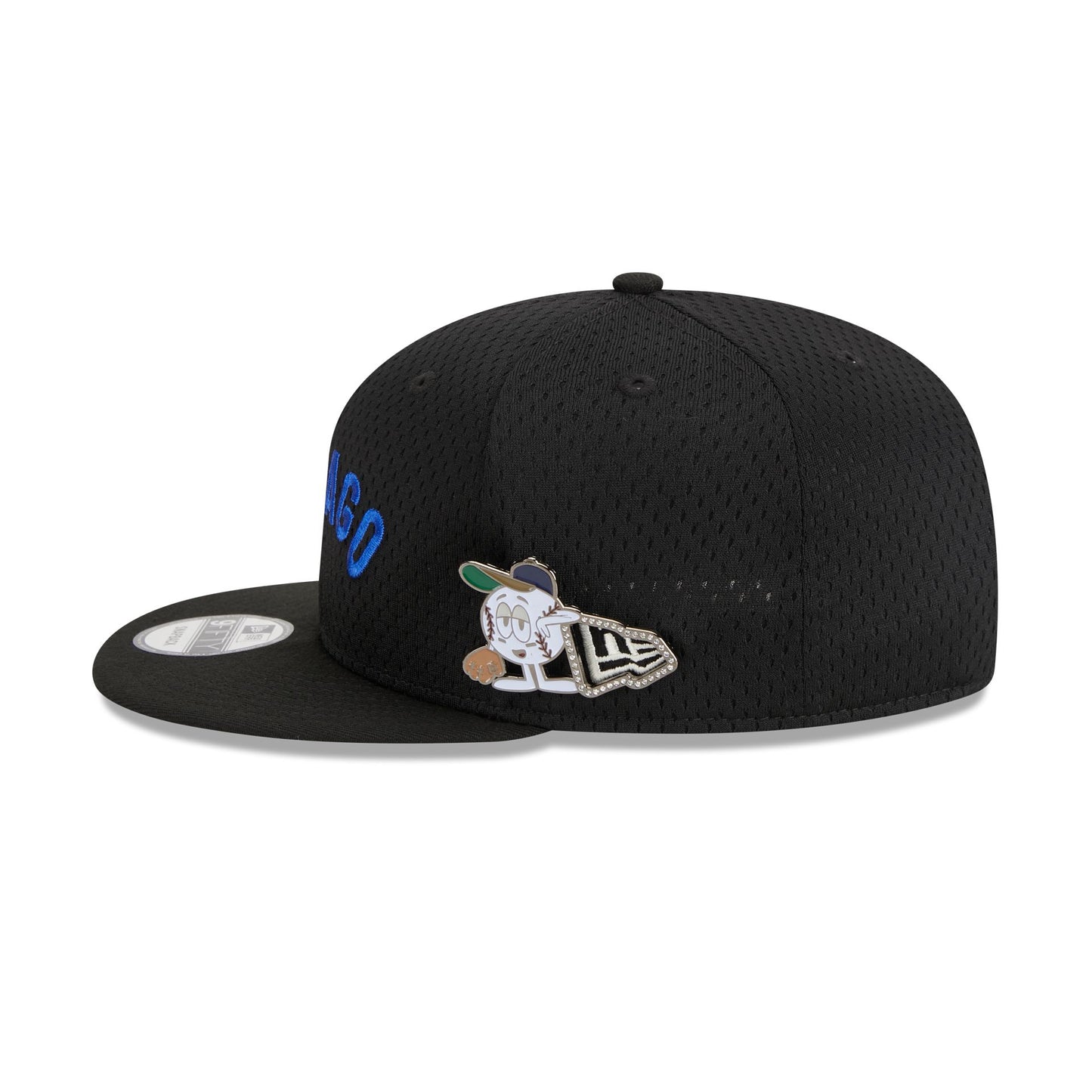 The Chicago Cubs Post-Up Pin 9FIFTY Snapback features a sport mesh fabrication with an embroidered Cubs wordmark at the front panels, a Wrigley Field patch at the right-wear side, and a snapback closure at the rear. Additional details include a baseball character pin at the left-wear side and a green undervisor.