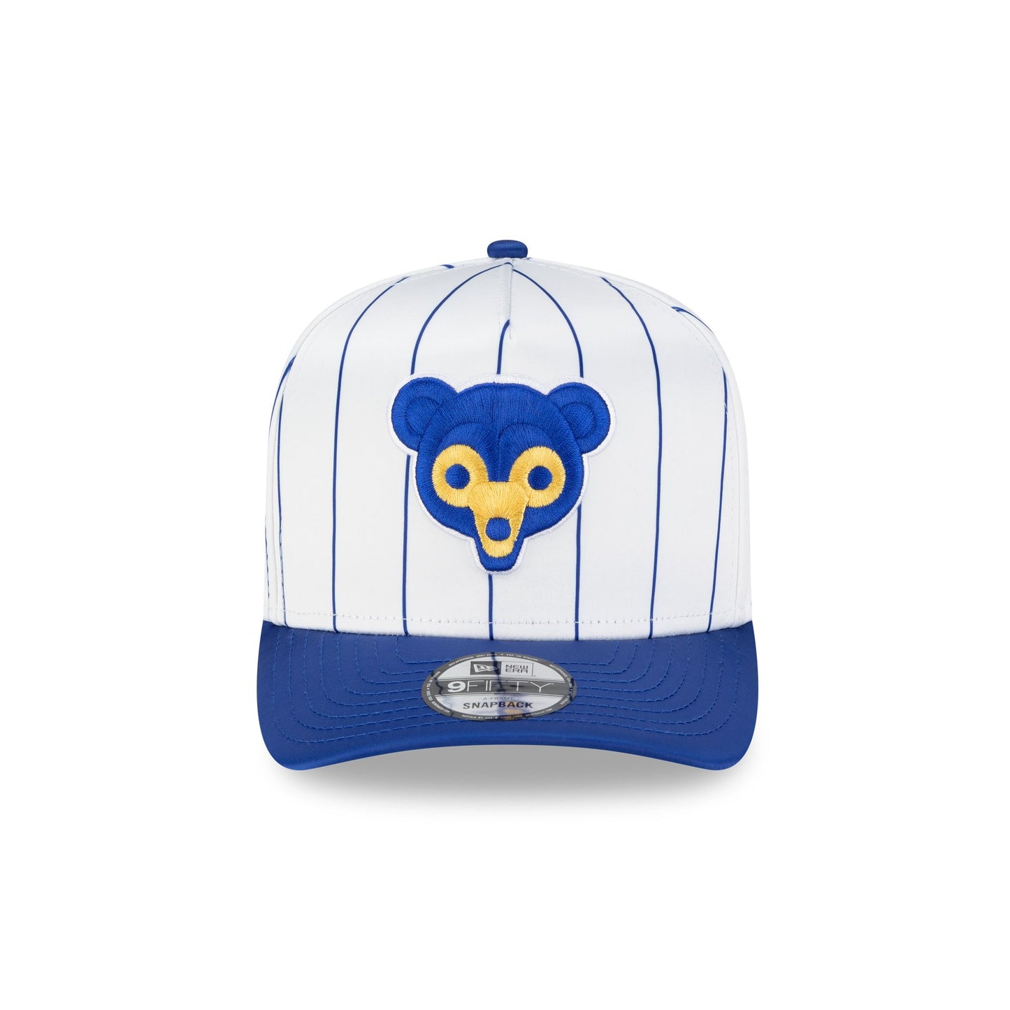 The Chicago Cubs Satin Pinstripe 9FIFTY A-Frame Snapback features an embroidered Cubs logo at the front panel with a team color visor, a gray undervisor, and a snapback closure at the rear.
