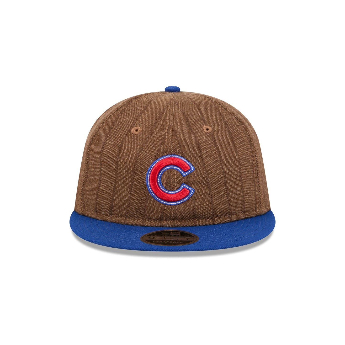 The Chicago Cubs Three Looms Wool Pinstripe Retro Crown 9FIFTY Adjustable Cap features an embroidered Cubs logo at the front panels with a matching MLB Batterman logo at the right-wear side, a green undervisor, and an adjustable buckle closure at the rear.