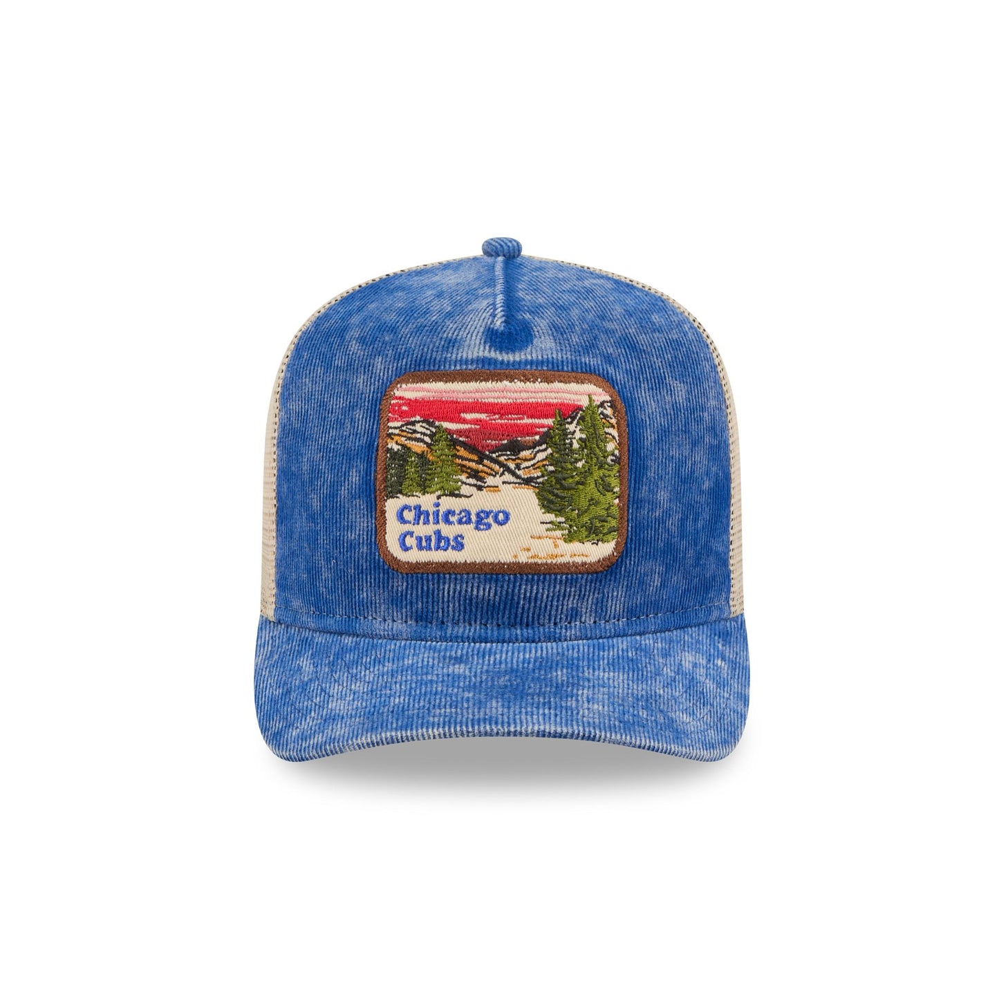 The Chicago Cubs Vintage Landscape 9FIFTY A-Frame Trucker features an embroidered Cubs Vintage Landscape patch at the front panels with a team logo at the right-wear side. Additional details include an adjustable snapback closure at the rear and a gray undervisor.