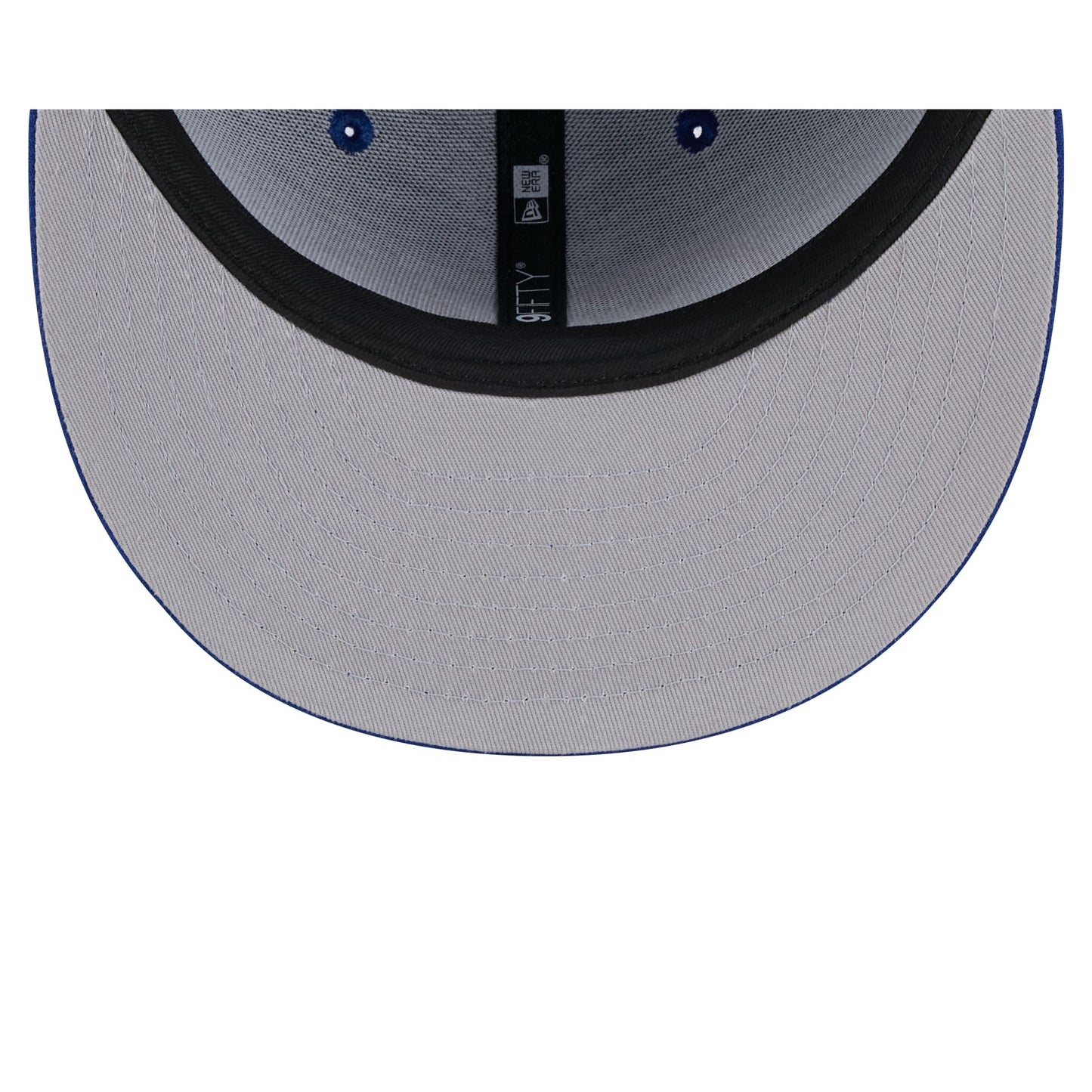 The Chicago Cubs Wordmark 9FIFTY Snapback features an embroidered Cubs wordmark at the front panels with a matching team logo at the right-wear side, a gray undervisor, and a snapback closure at the rear.
