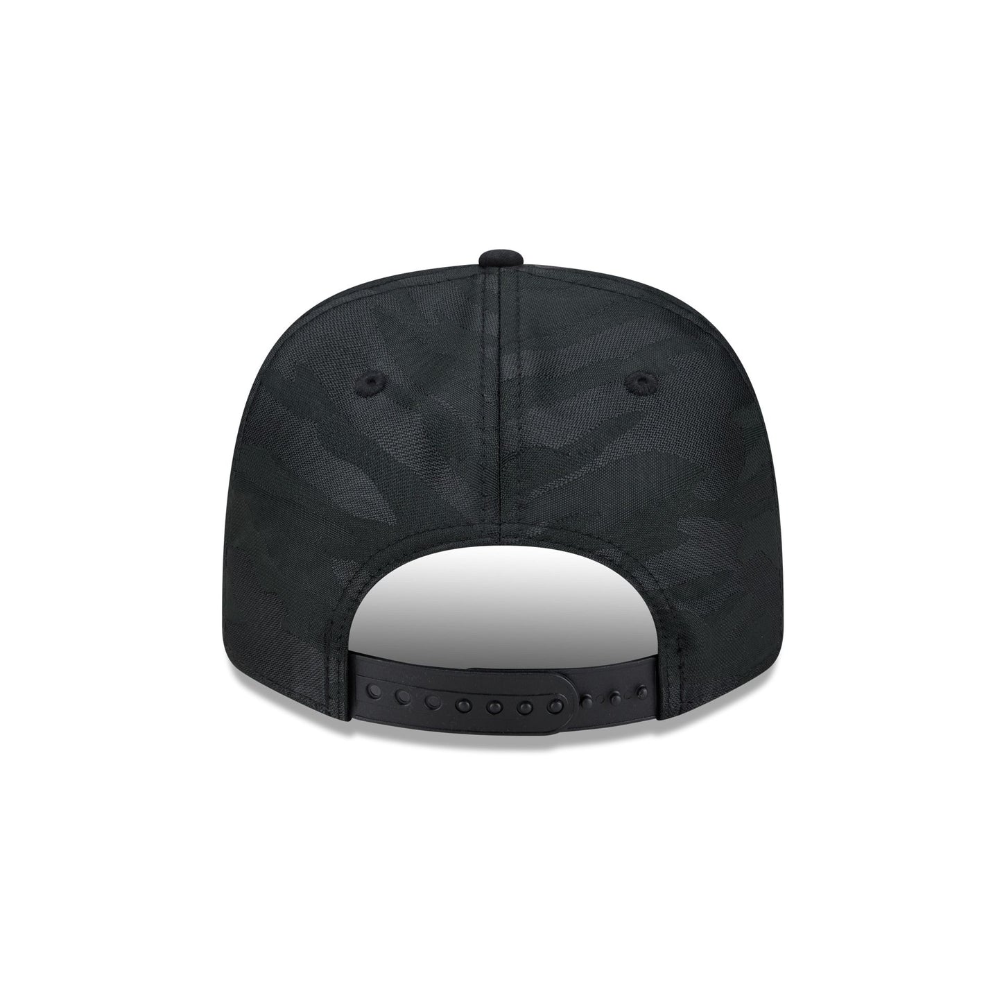 The Chicago White Sox Black Camo Split Panel 9SEVENTY Stretch-Snap features an embroidered White Sox white wordmark at the front panel with a split crown construction and a team logo at the right-wear side. Additional details include a black camo print throughout, an adjustable stretch-snap closure at the rear, and a gray undervisor.