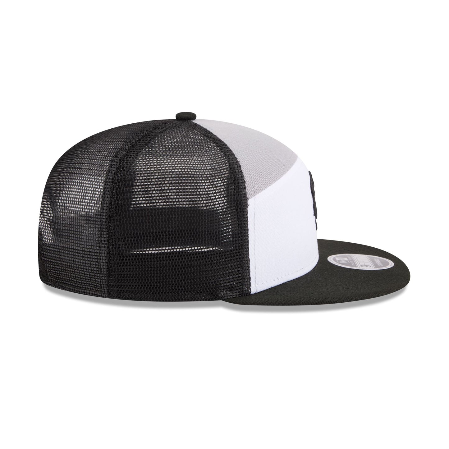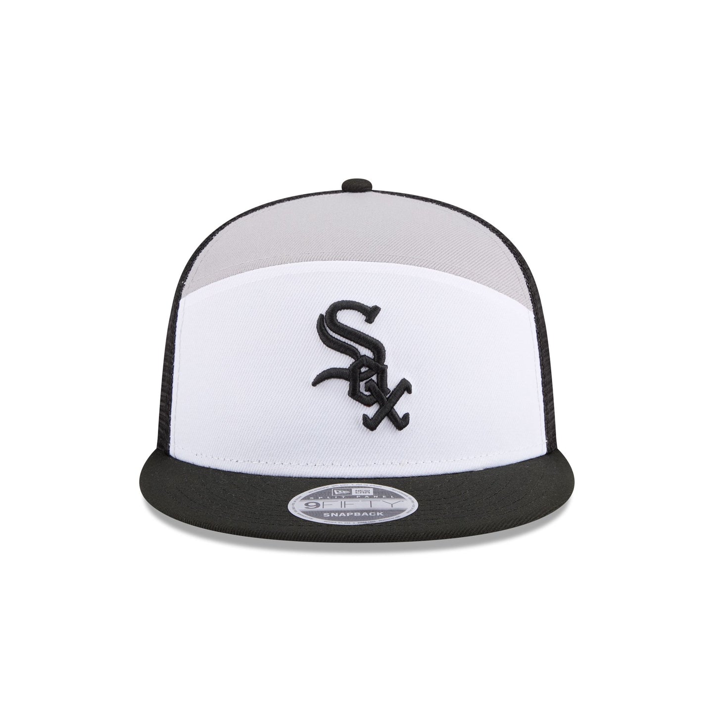 The Chicago White Sox Block Split Panel 9FIFTY Trucker features an embroidered White Sox logo at the front panels with a split crown construction. Additional details include an adjustable snapback closure at a mesh rear and a gray undervisor.