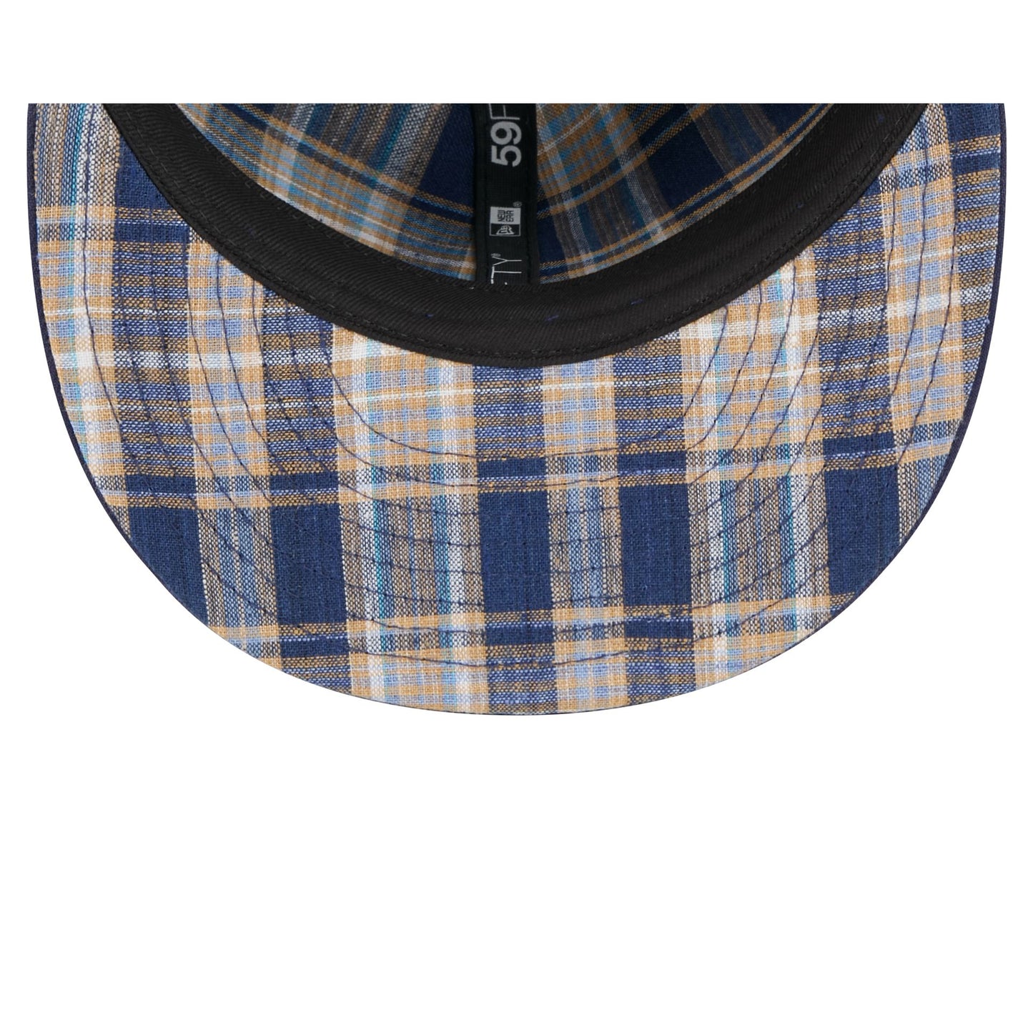 The Chicago White Sox Blue Tartan 59FIFTY Fitted Cap features an embroidered White Sox logo at the front panels with a matching MLB Batterman logo at the rear. Additional details include a plaid team patch at the right-wear side and a plaid undervisor.