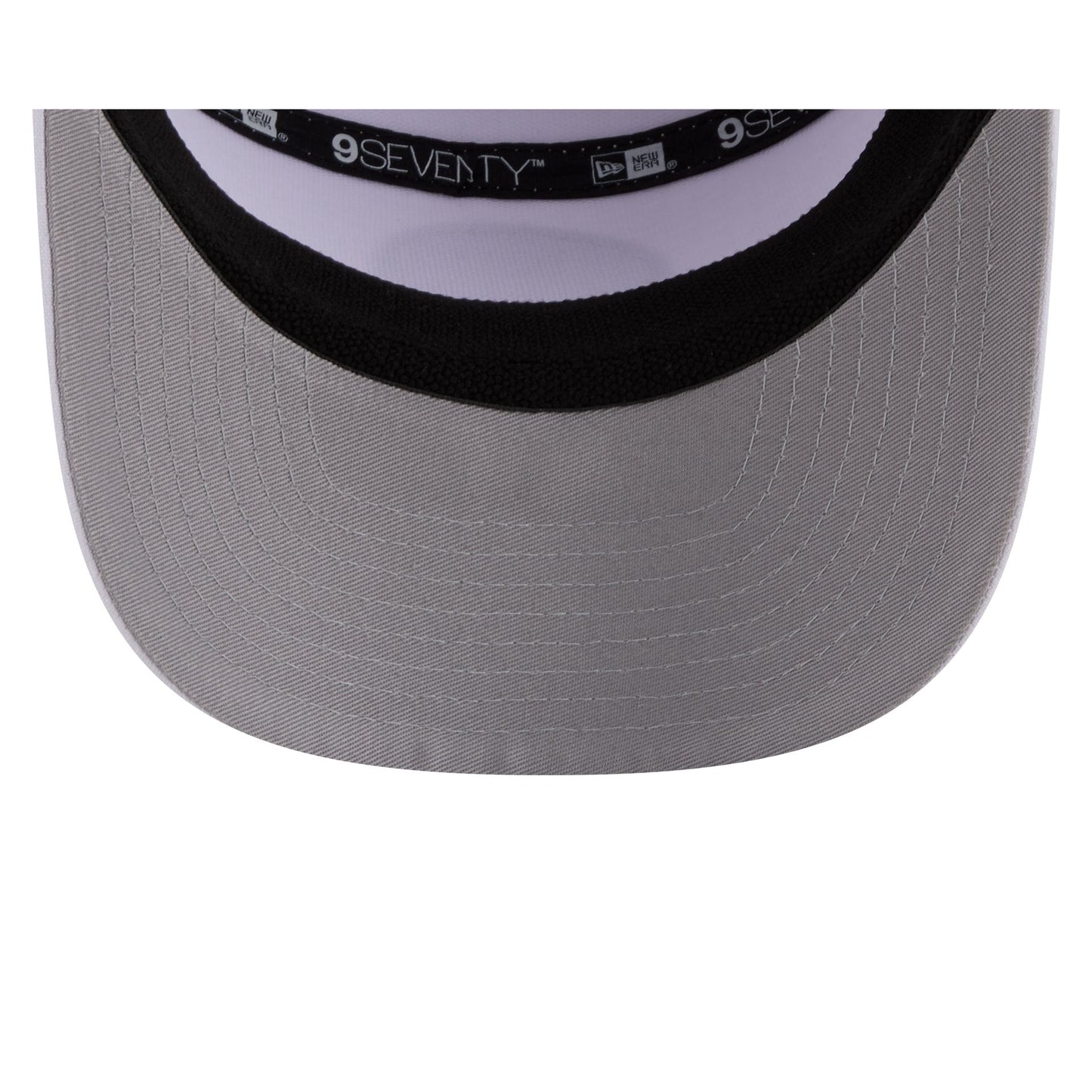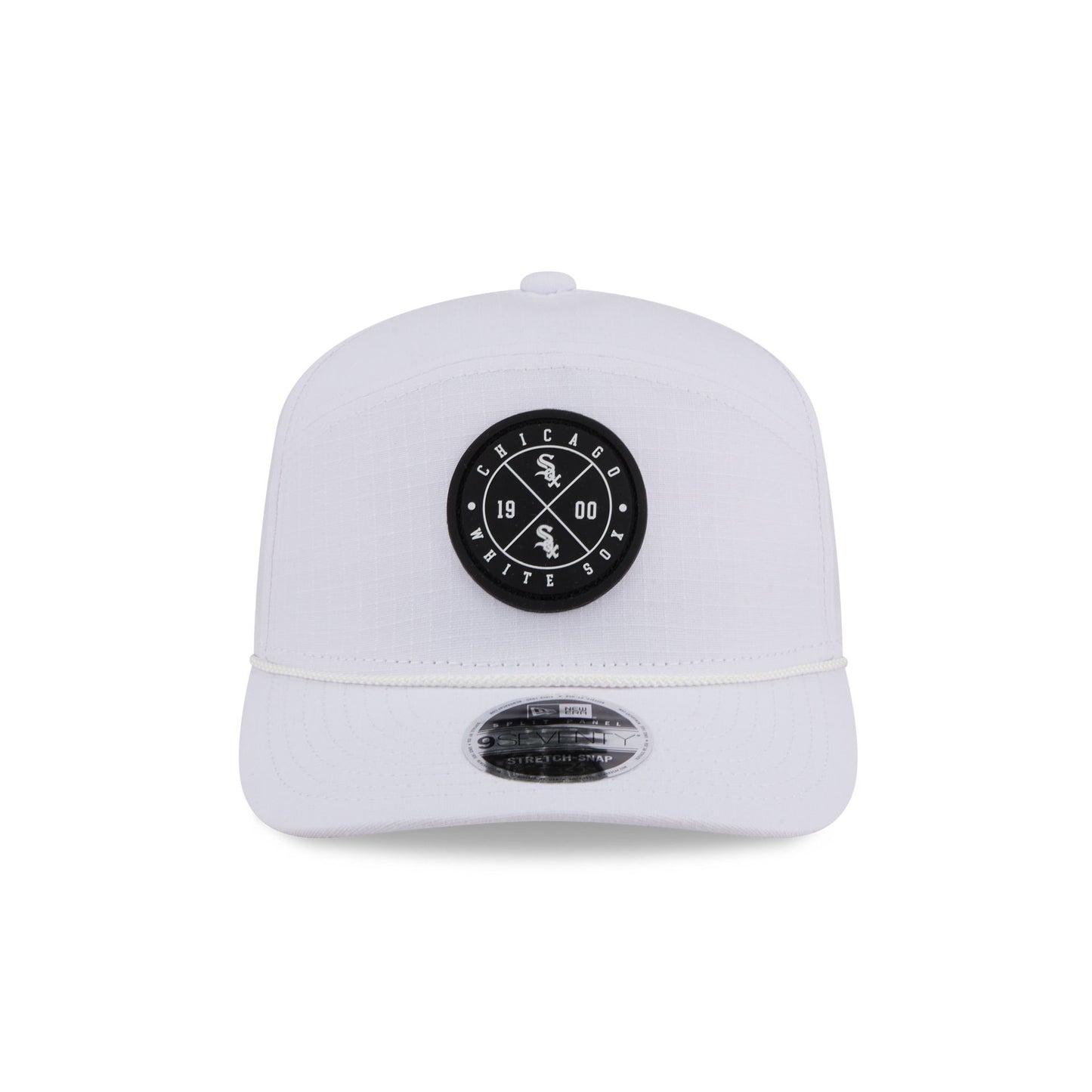 The Chicago White Sox Circle Logo White Split Panel 9SEVENTY Stretch-Snap features a woven silicone White Sox circle logo at the front panel with a split crown construction and light-weight fabrication. Additional details include an adjustable stretch-snap closure at the rear and a gray undervisor.