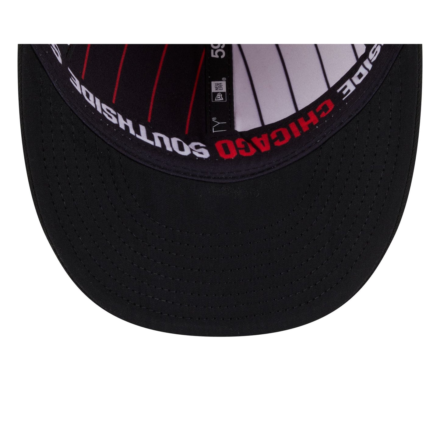 The Chicago White Sox City Connect Low Profile 59FIFTY Fitted Cap features an embroidered White Sox logo at the front panels with a matching MLB Batterman logo at the rear. Additional details include a black undervisor and a "Southside" sweatband.