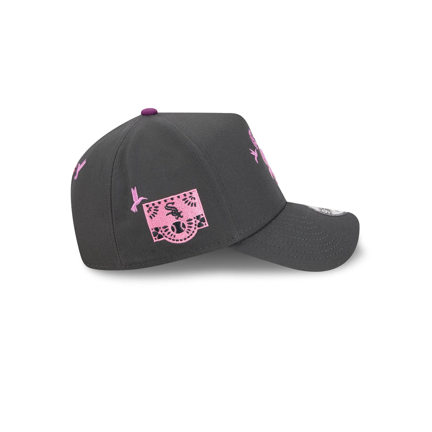 The Chicago White Sox Day of the Dead Graphite 9FORTY A-Frame Snapback features an embroidered White Sox logo at the front panels with marigold (cempasúchil) and hummingbird designs throughout, representing the Legend of Xóchitl and Huitzilin. Additional details include a team patch at the right-wear side and an adjustable snapback closure at the rear.