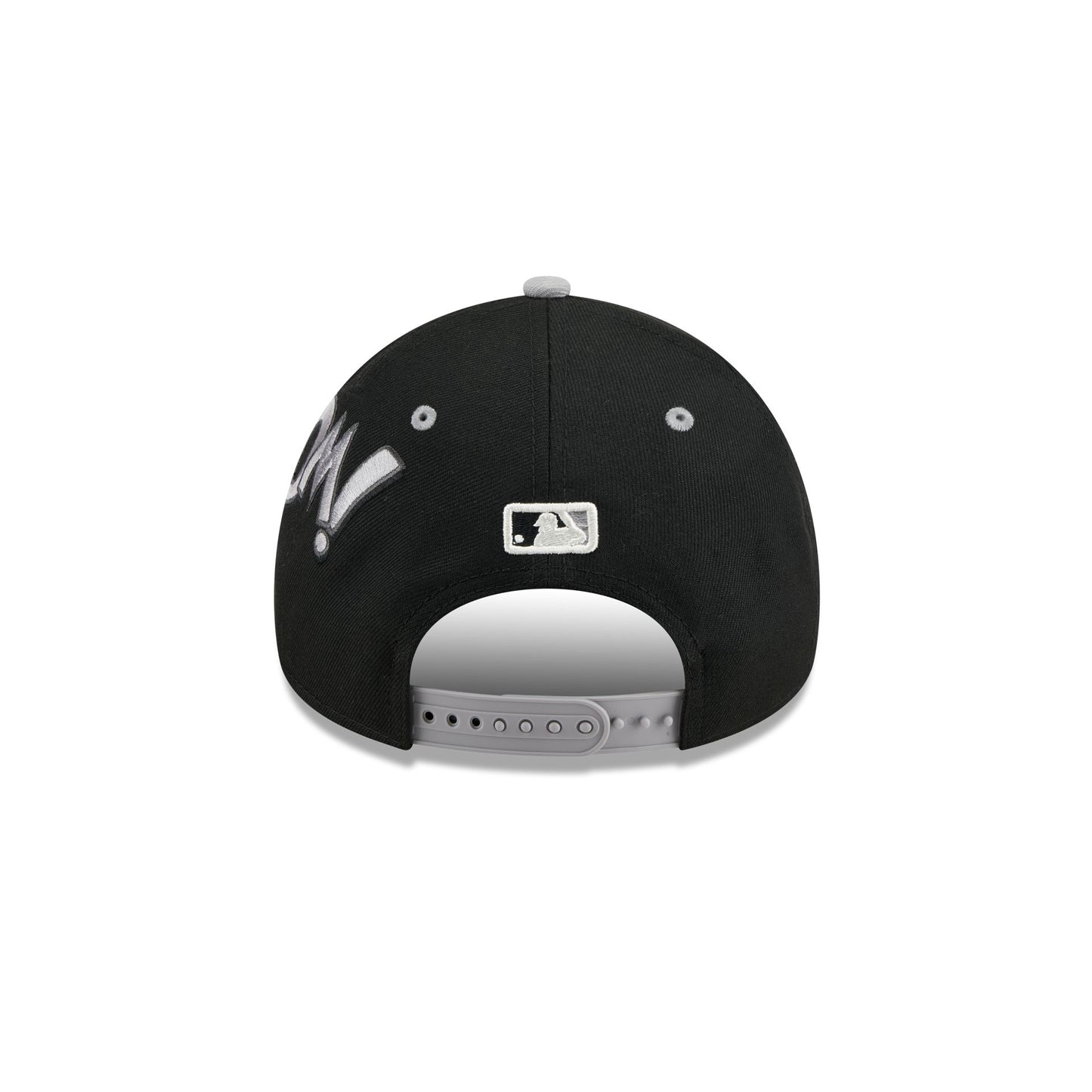 The Chicago White Sox Diamond Hero Edition 9FORTY A-Frame Snapback features an embroidered White Sox onomatopoeia pop wordmark at the front panels with baseball comic book prints at the front and back panel. Additional details include a ZOOM! wordmark at the left-wear side, the MLB Batterman logo above a snapback closure at the rear, and a black undervisor.