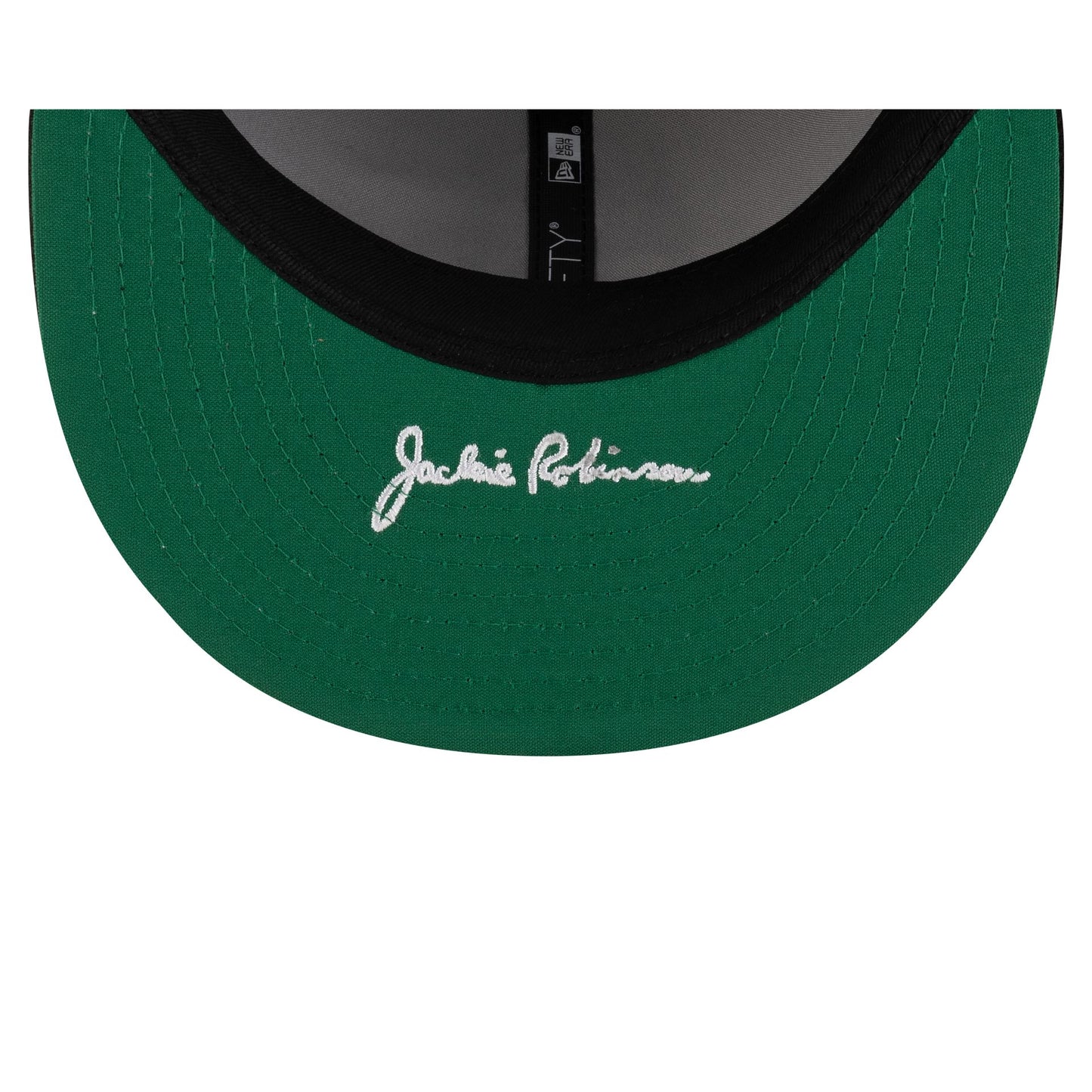 The Chicago White Sox Jackie Robinson Day 2025 Retro Crown 9FIFTY Snapback features an embroidered White Sox logo at the front panels with an MLB Batterman logo above a snapback closure at the rear. Additional details include a Jackie Robinson pin at the left panel and Robinson's embroidered signature on a green undervisor.