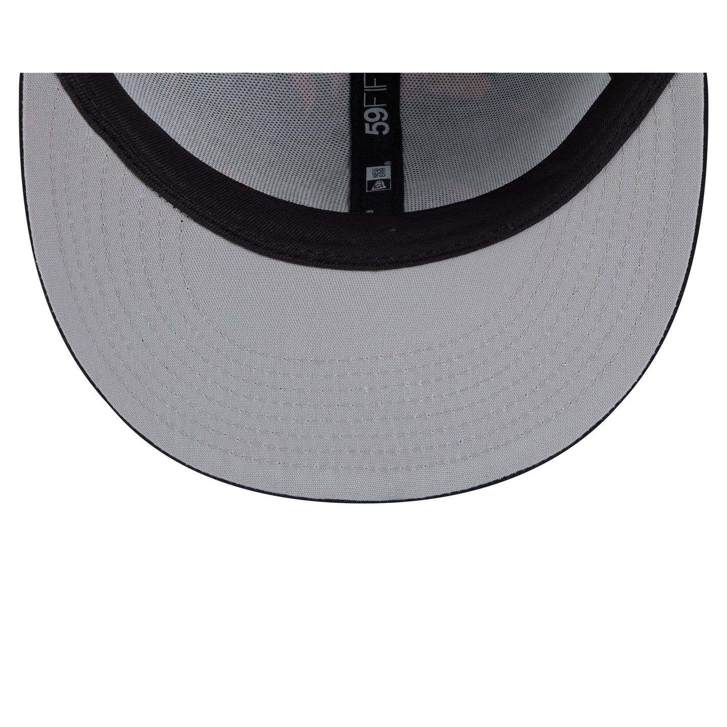 The Chicago White Sox Leaves 59FIFTY Fitted Cap features an embroidered White Sox logo at the front panels against a forest nature pattern throughout. Additional details include a team patch at the right-wear side, a matching MLB Batterman logo at the rear, and a gray undervisor.