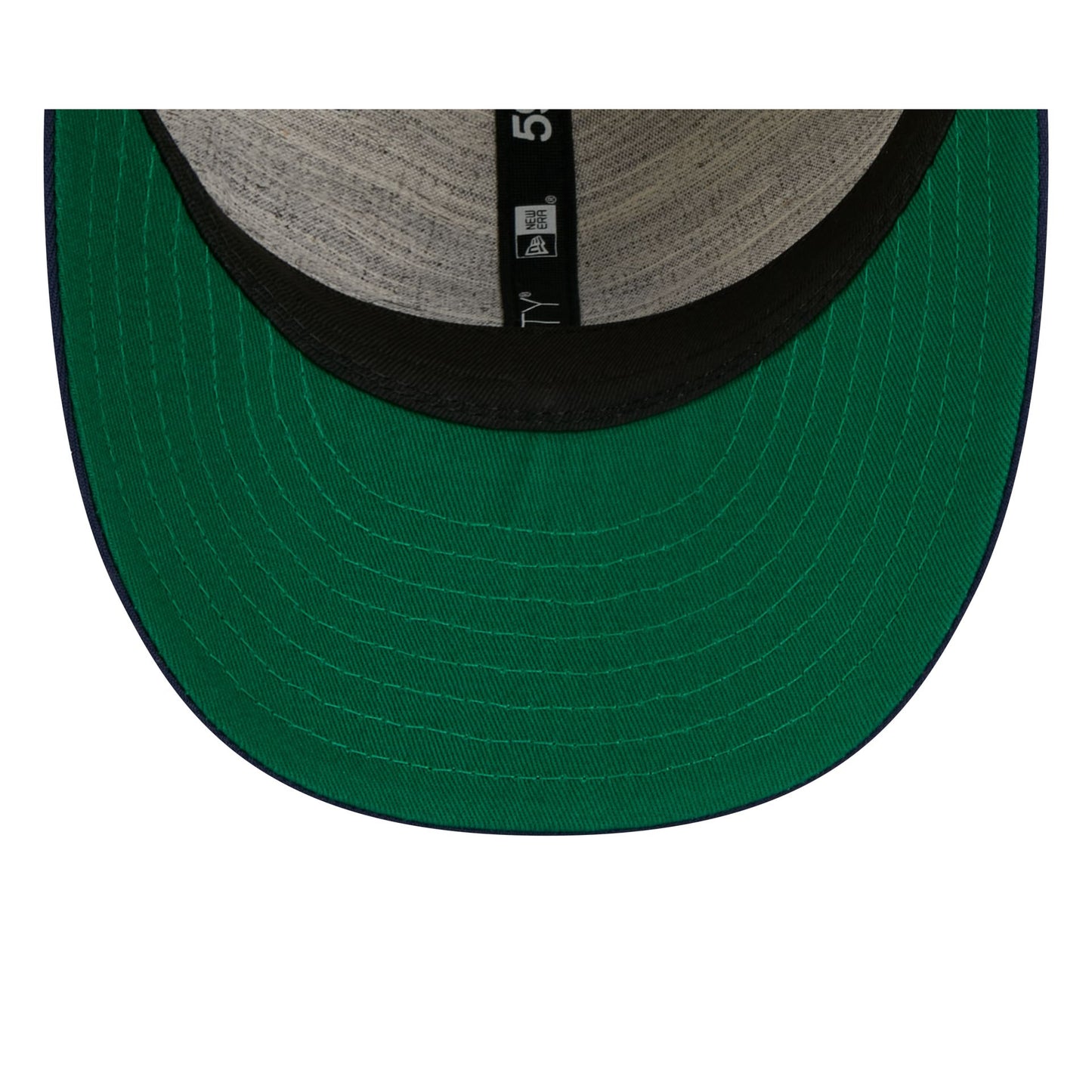 The Chicago White Sox Linen Pinstripe Retro Crown 59FIFTY Fitted Cap features an embroidered White Sox Cooperstown logo at the front panels against a linen pinstripe fabrication throughout. Additional details include the MLB Batterman logo at the rear and a green undervisor.