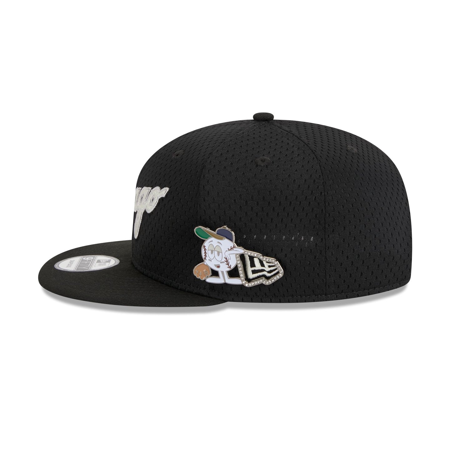 The Chicago White Sox Post-Up Pin 9FIFTY Snapback features a sport mesh fabrication with an embroidered White Sox wordmark at the front panels, a 1991 Comiskey Park Inaugural Year patch at the right-wear side, and a snapback closure at the rear. Additional details include a baseball character pin at the left-wear side and a green undervisor.