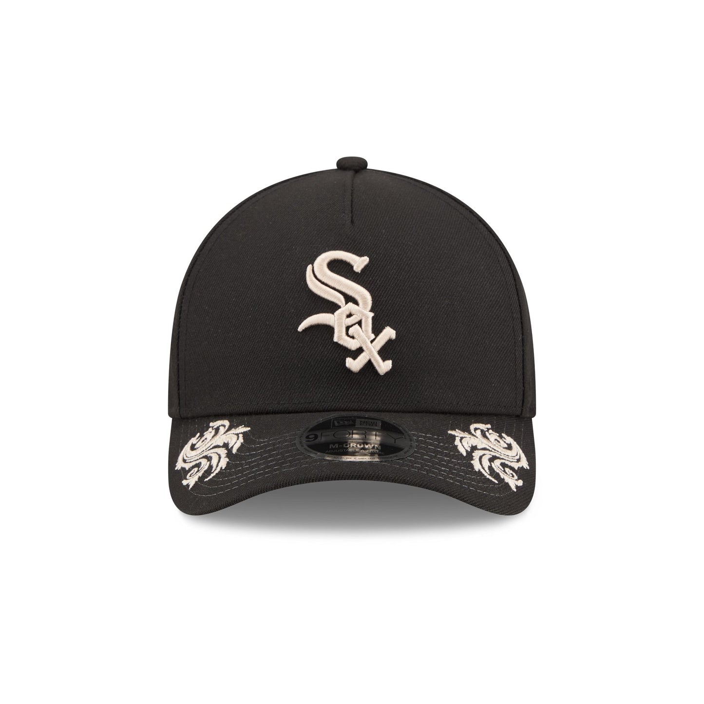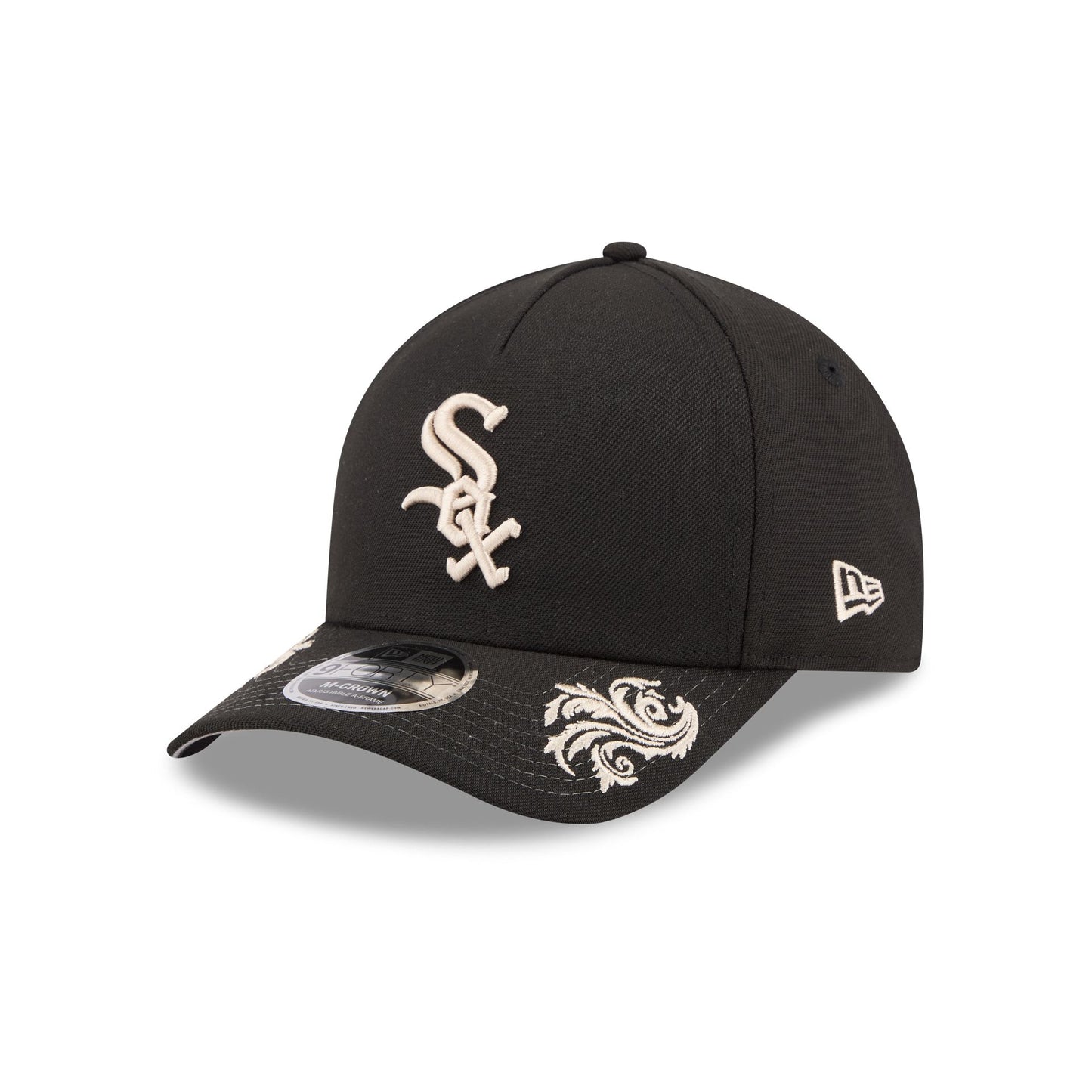 The Chicago White Sox Script 9FORTY M-Crown A-Frame Snapback features an embroidered White Sox logo at the front panel with an adjustable snapback closure at the rear. Additional details include a team script at the right-wear side with ornamental details throughout the cap and a gray undervisor.