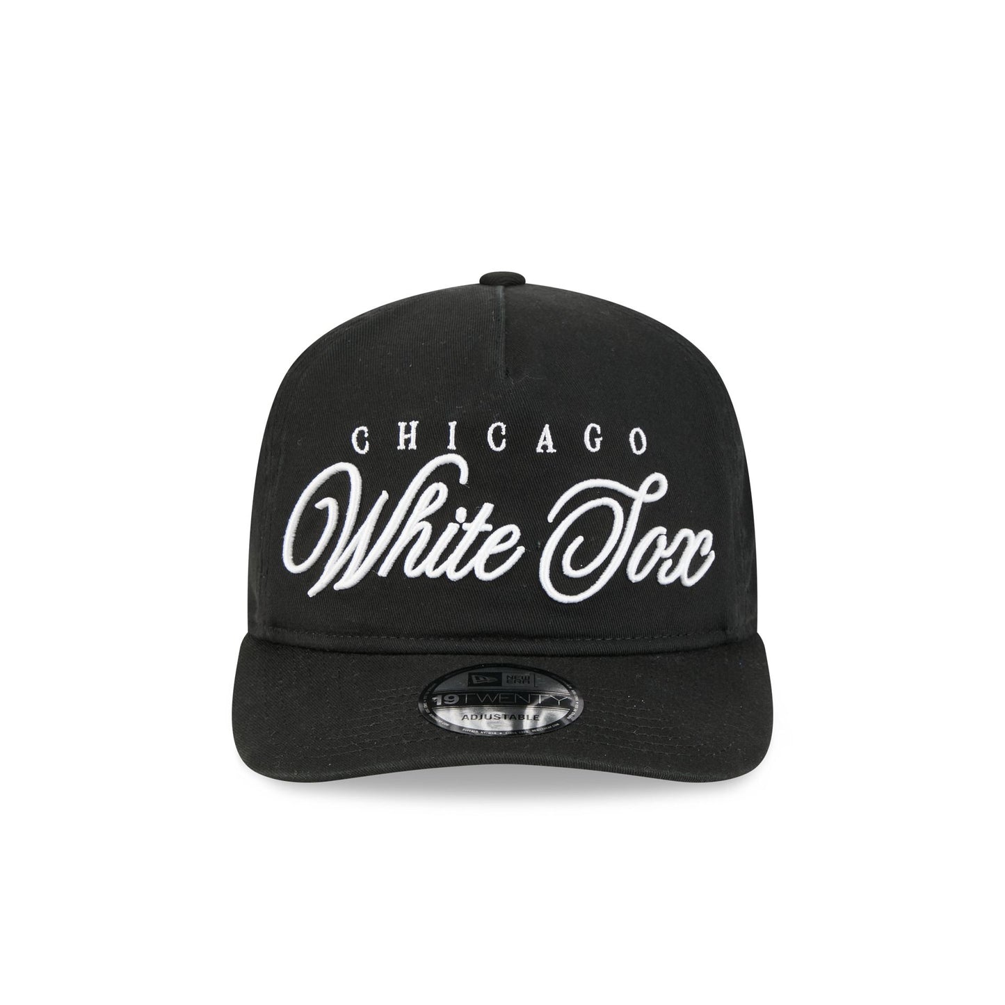 The Chicago White Sox Scripted 19TWENTY Adjustable Cap features an embroidered White Sox script wordmark at the front panels with a team logo at the right-wear side. Additional details include an adjustable snapback closure at the rear and a gray undervisor.